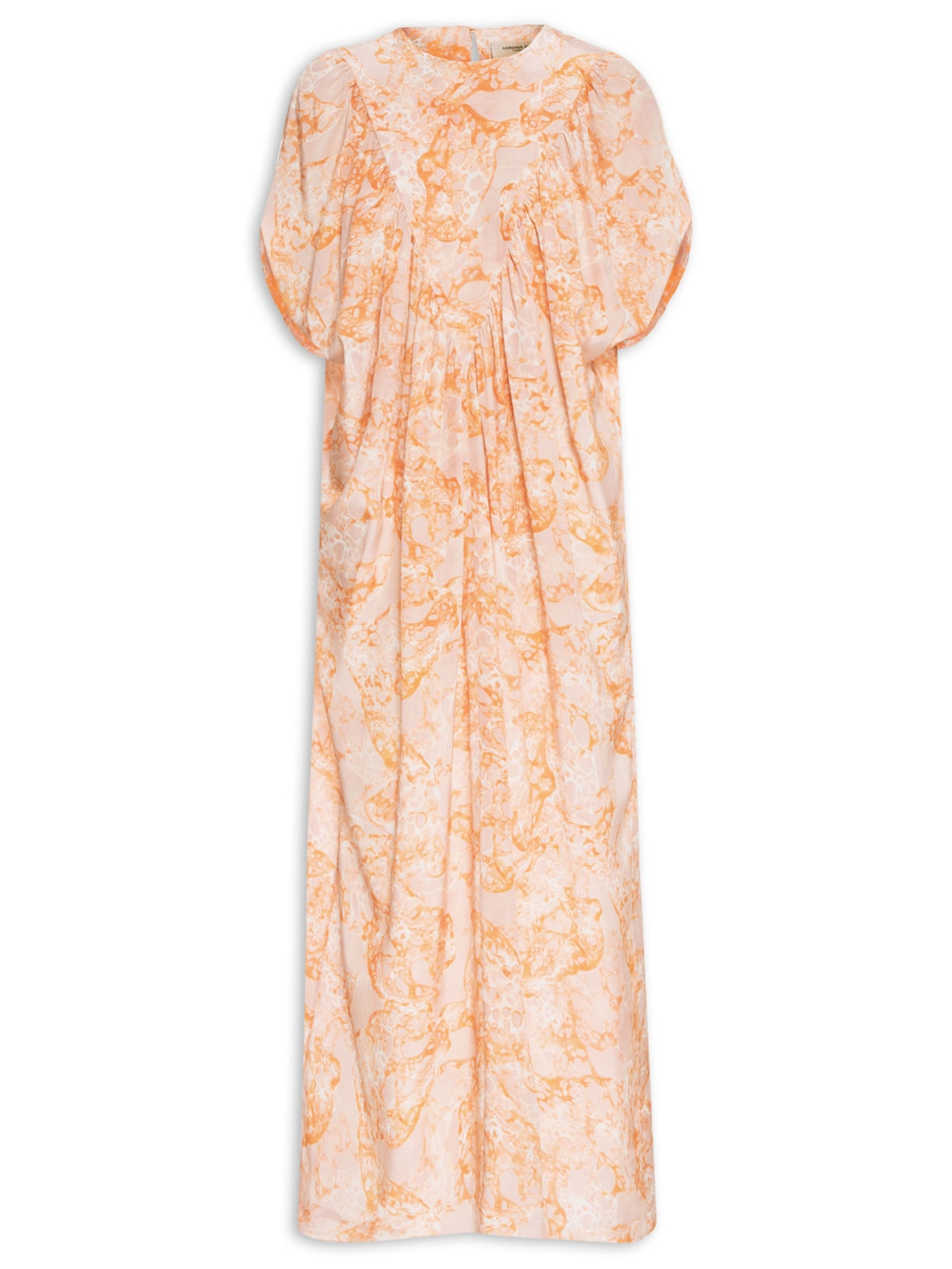O kaftan rosa é confeccionado em seda sem elasticidade. A peça solta ao corpo possui decote redondo, mangas curtas, recorte posterior vazado com botão aplicado, estampa abstrata e tons contrastantes, recorte frontal com detalhe de franzido e comprimento longo.