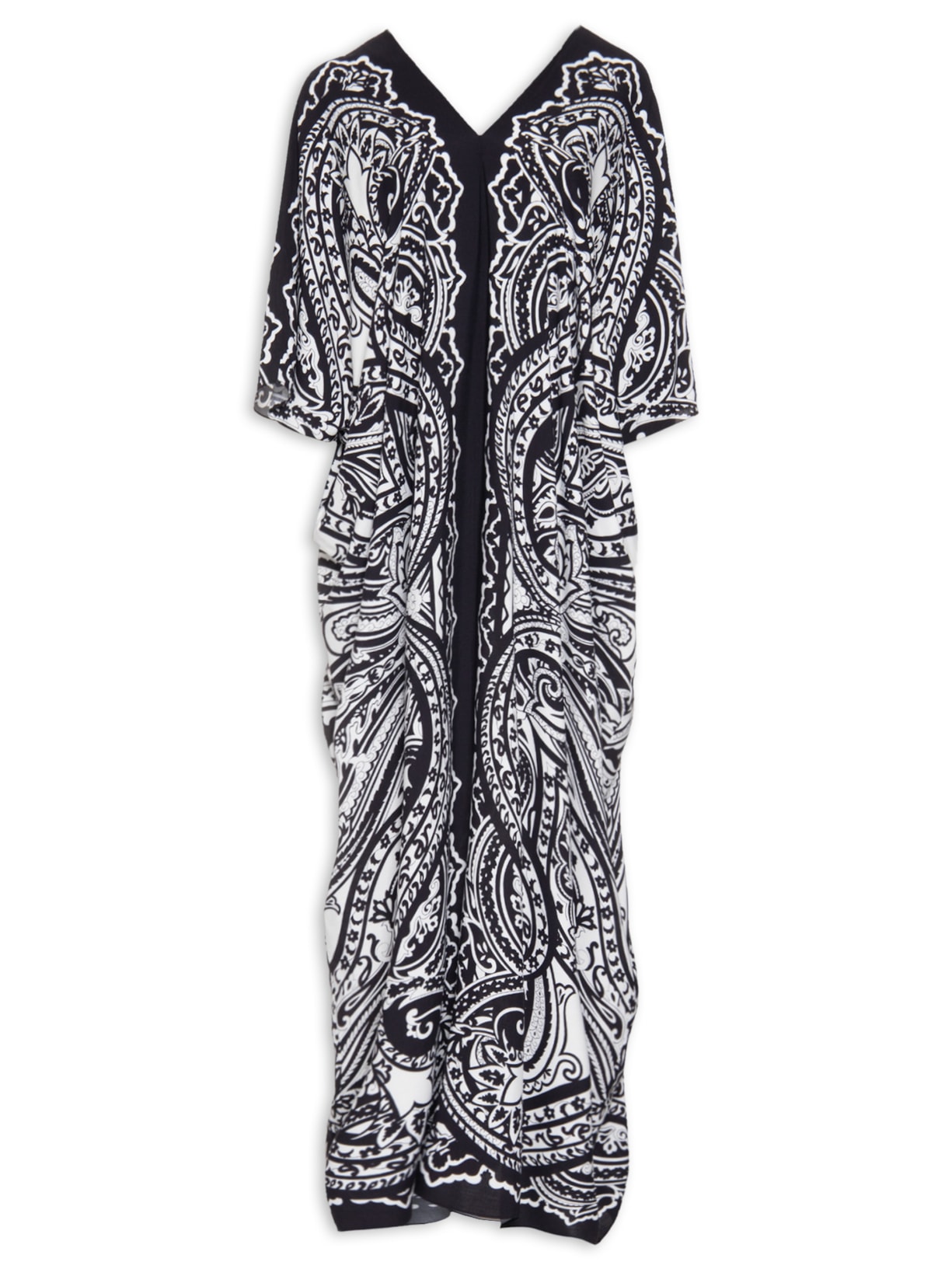 Invista em peças de estampas diferenciadas para sair do óbvio sem perder o estilo. Sugerimos investir neste kaftan Souq com sandálias puffer e brincos detalhados para finalizar a produção.