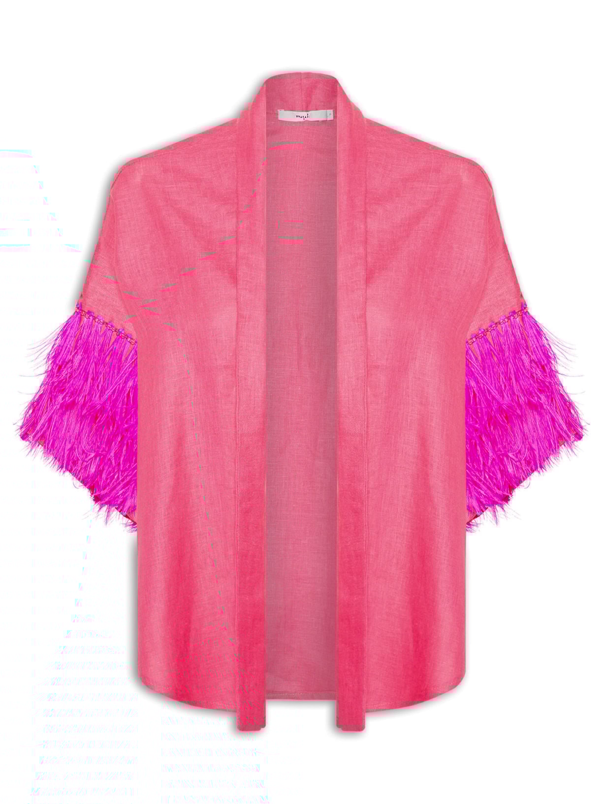 O kimono rosa é confeccionado em linho. A peça possui  mangas curtas com detalhe de miçangas e plumas aplicadas, ombros estendidos, shape solto, caimento reto, acabamento pespontado e não possui fechamento.