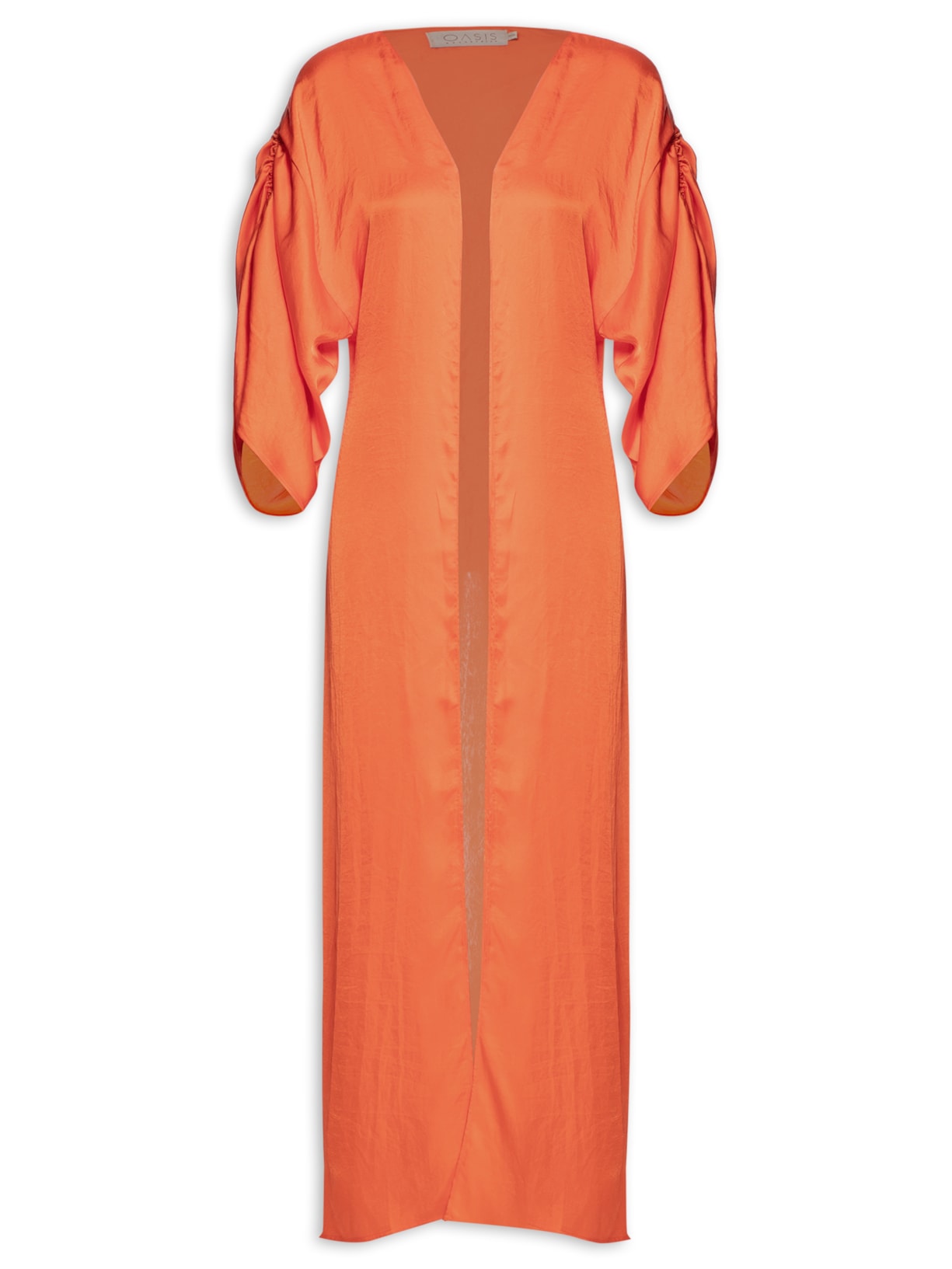 O kimono laranja é confeccionado em tecido leve com superfície acetinada. A peça possui ombros estendidos, mangas 3/4 com cordão para ajuste de franzido, comprimento alongado, shape solto, caimento reto e acabamento pespontado.