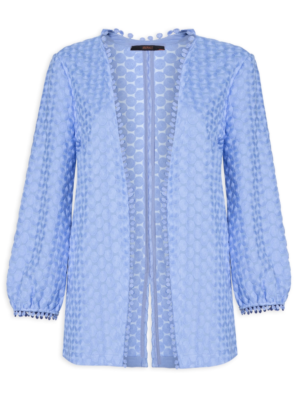 O kimono azul é confeccionado em tecido leve sem elasticidade. A peça solta ao corpo possui mangas longas, fenda posterior, aplicação de bordados com formato de espiral e acabamento com aplicação de passamanaria.