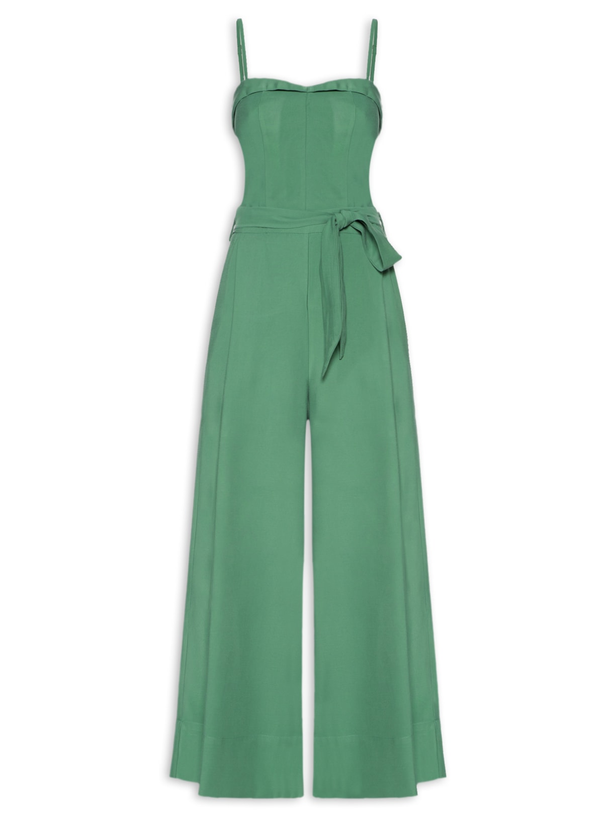 O macacão verde é confeccionado em tecido leve sem elasticidade. A peça solta ao corpo possui decote coração com recorte sobreposto, alças finas com regulagem, bolsos de modelo faca, bolsos posteriores, recortes frontais e posteriores, lástex embutido na parte posterior na altura do busto, cinto de mesma cor para uso opcional, barra italiana e comprimento longo.