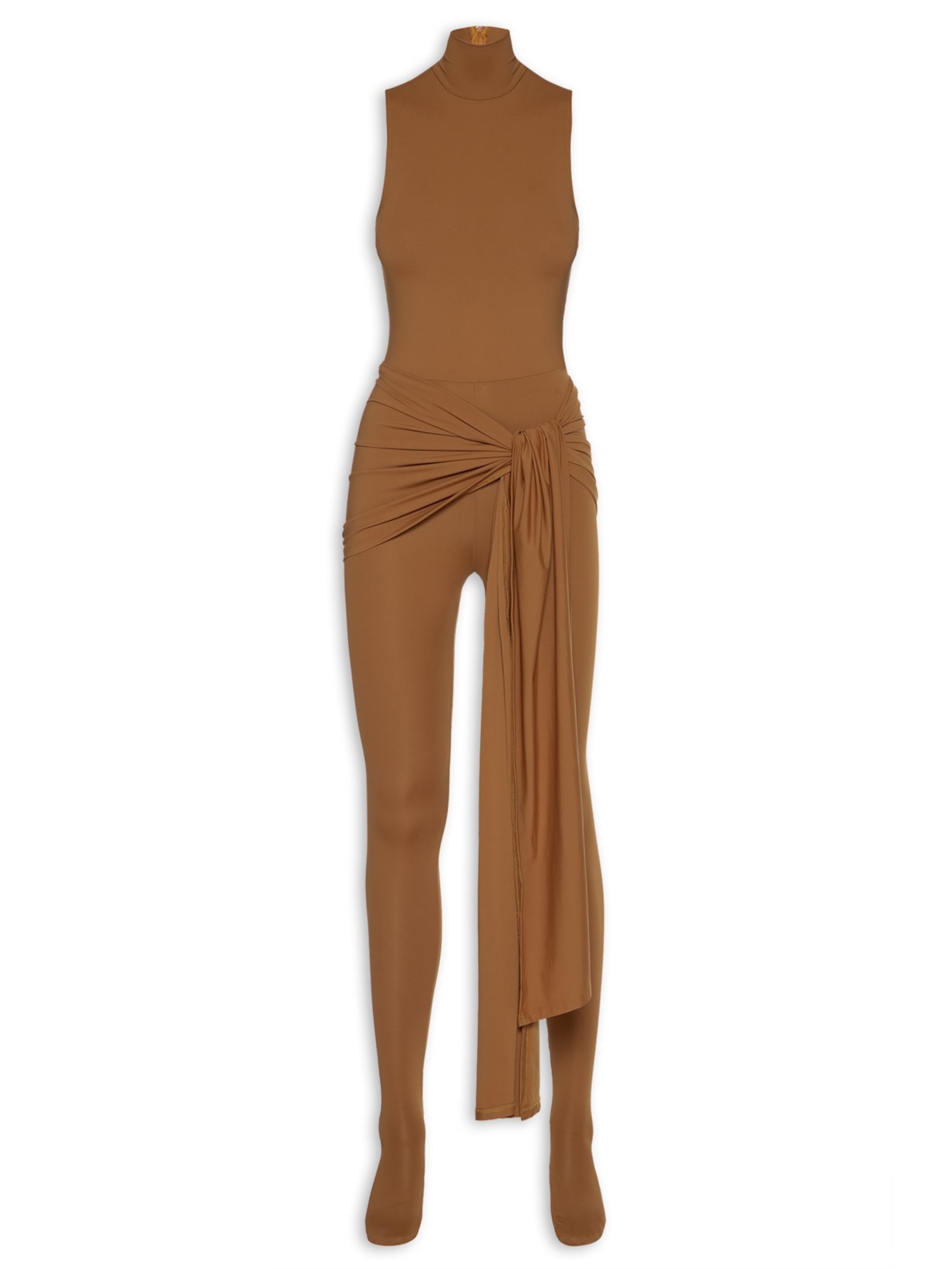O macacão marrom é confeccionado em malha de poliamida com alta elasticidade. A peça justa ao corpo possui gola alta, cavas regulares, recorte frontal e posterior na altura da cintura, barra estendida até os pés, comprimento longo e fechamento posterior por zíper. Acompanha faixa na mesma cor e tecido para uso opcional.