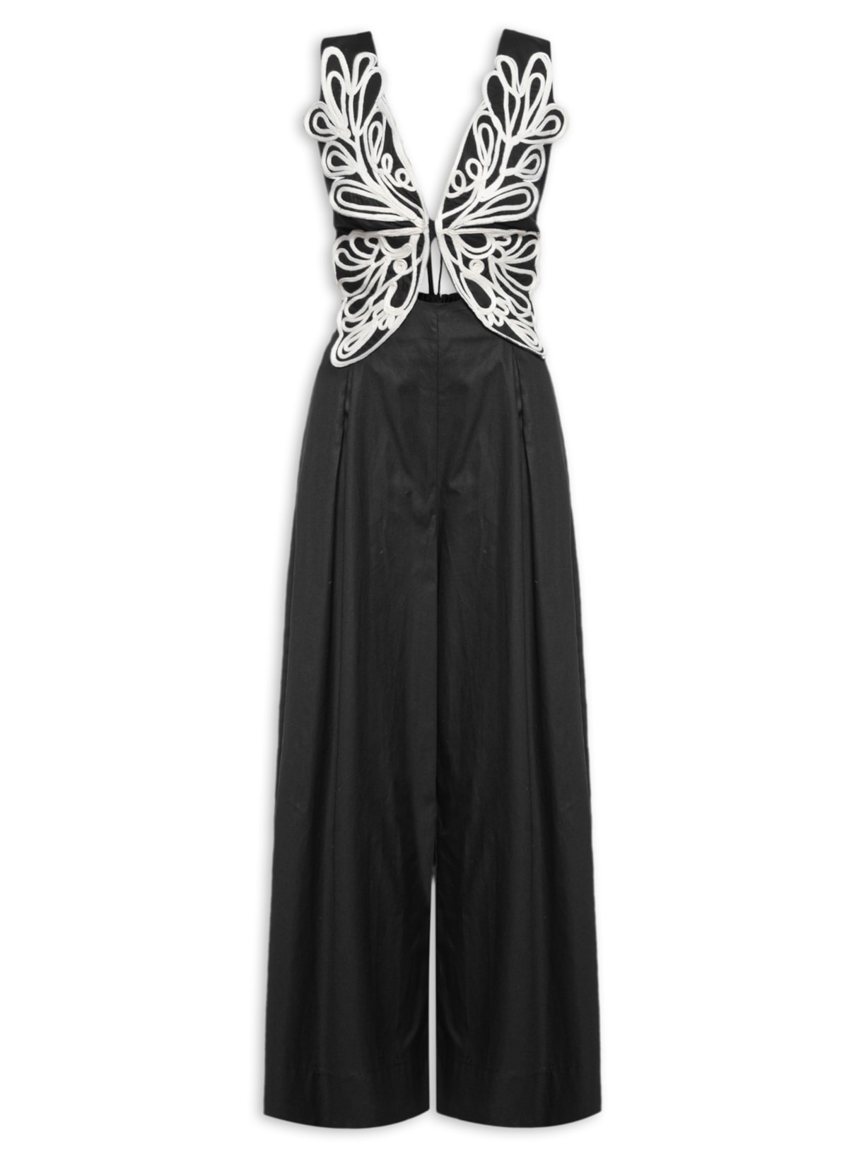 O macacão preto é confeccionado em tecido leve sem elasticidade. A peça justa no busto e solta no comprimento possui decote V profundo, alças médias, cavas estendidas, recorte na cintura com elástico embutido na parte posterior, cordões alongados na parte posterior, bordado frontal abstrato em cor contrastante, recorte frontal vazado, pregas frontais na altura da cintura, comprimento longo e fechamento posterior por zíper invisível.