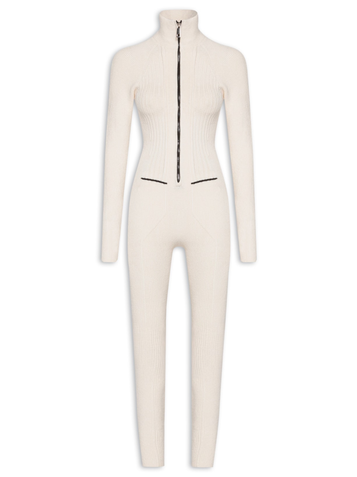 O macacão off white é confeccionado em tricot com superfície canelada com baixa elasticidade. A peça justa ao corpo possui gola alta, mangas longas de modelo raglan, mangas com recorte de polegar nos punhos,  padronagem em alto contraste na cor preta na altura da cintura, comprimento longo e fechamento frontal na parte da gola por zíper.