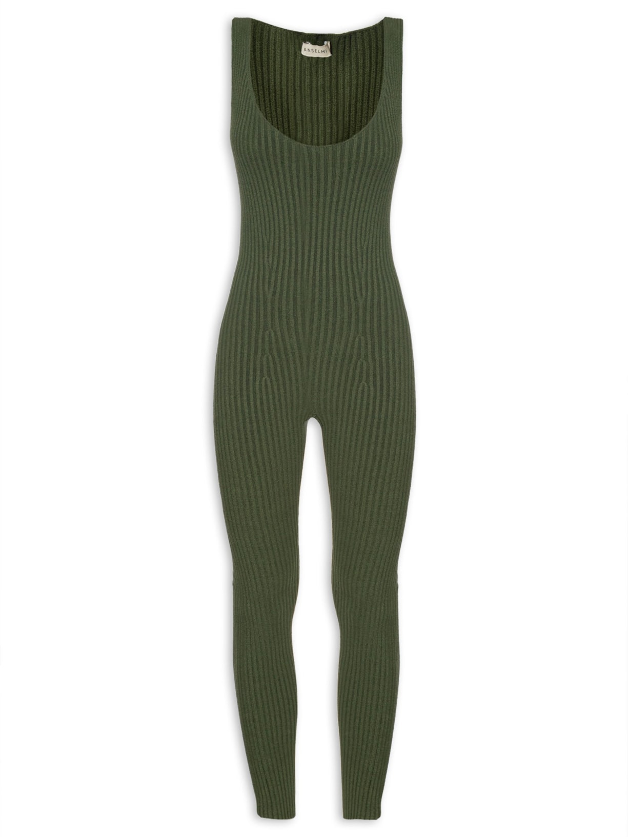 O macacão verde é confeccionado em tricot com alta elasticidade. A peça justa ao corpo possui decote U, alças médias, cavas regulares, sem bojo e comprimento longo.