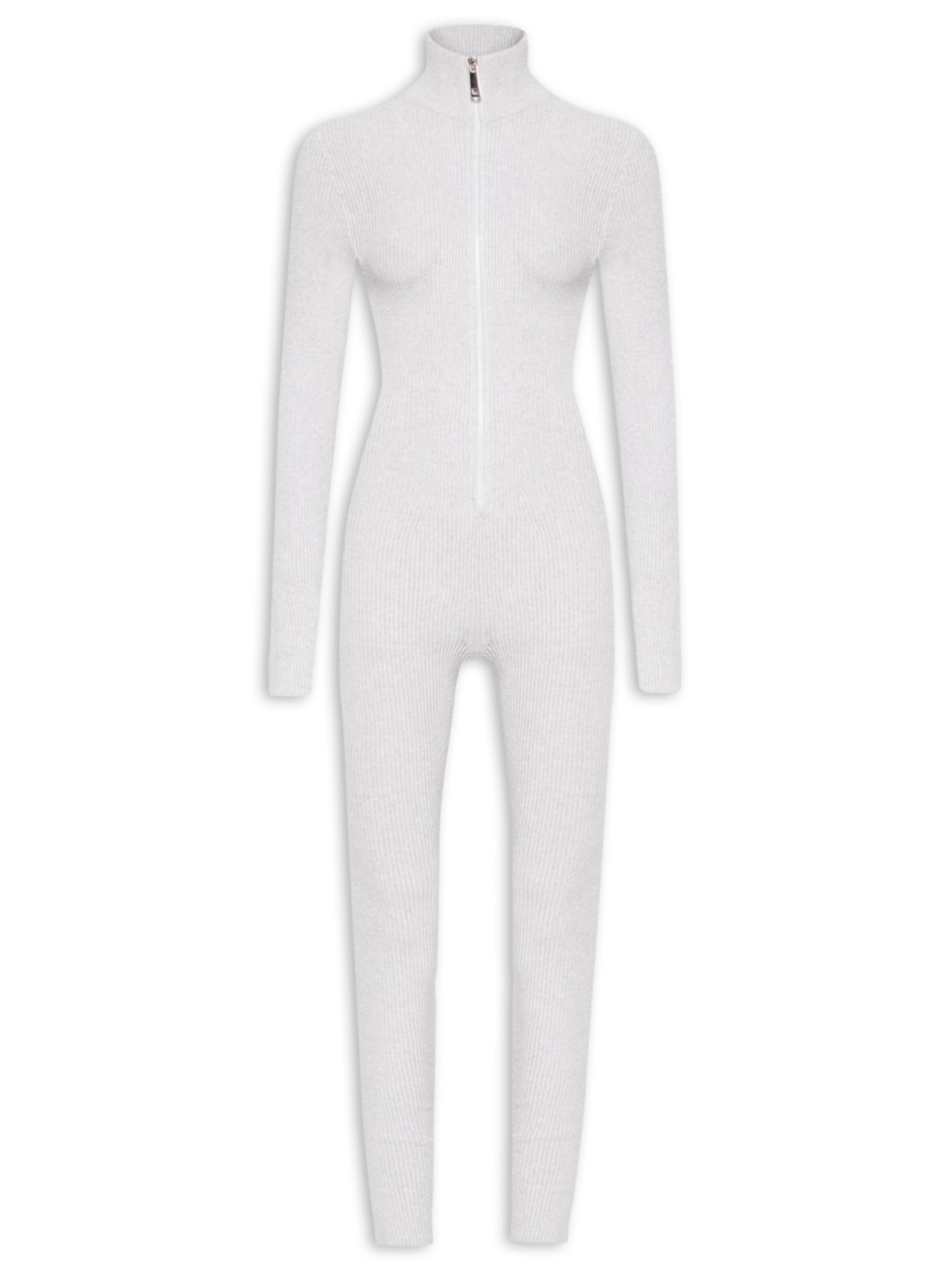 O macacão cinza é confeccionado em tricot com superfície canelada e média elasticidade. A peça justa ao corpo possui gola alta, mangas longas com abertura para o dedo, comprimento longo e fechamento frontal por zíper.