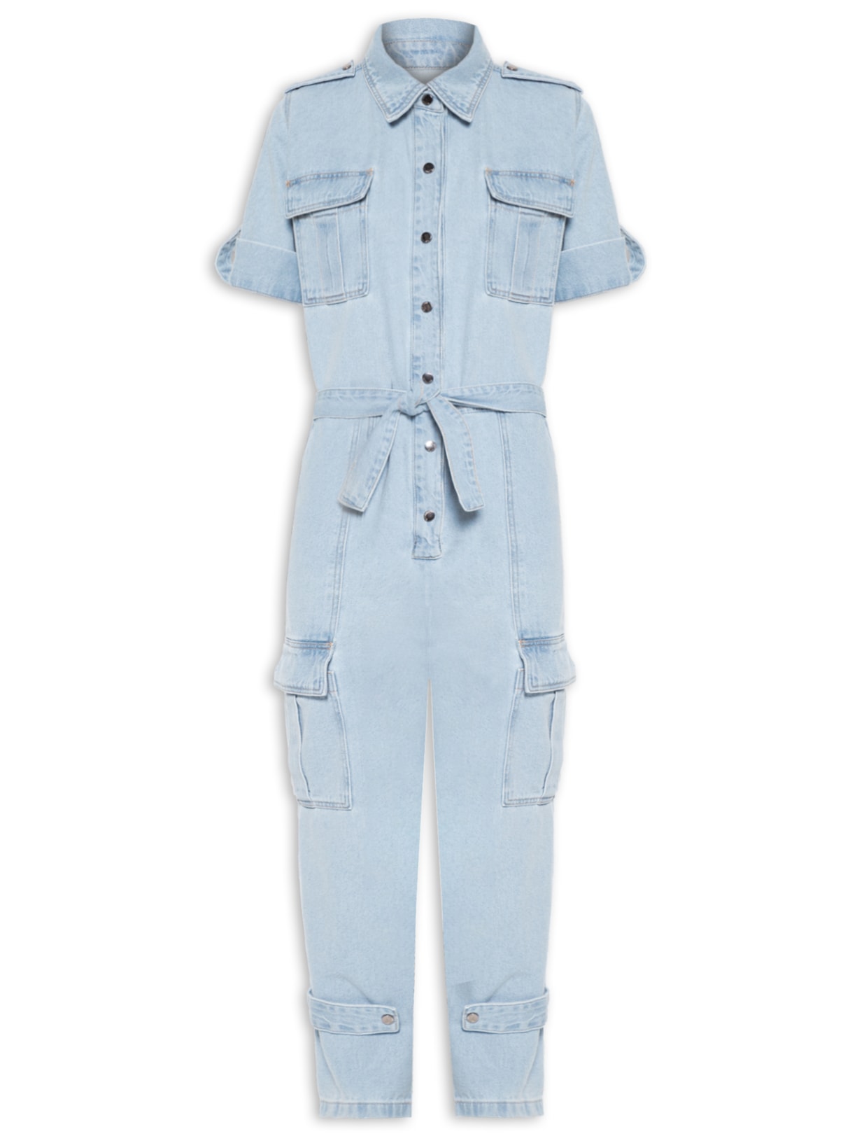 O macacão azul é confeccionado por sarja com lavagem em jeans sem elasticidade. A peça solta ao corpo possui colarinho simples, mangas curtas com barra italiana e martingale aplicado, bolsos frontais com aba sobreposta na altura do busto, passantes aplicados na altura da cintura, bolsos modelo faca, bolsos posteriores, bolsos laterais com aba sobreposta, recortes frontais e posteriores, comprimento longo, martingale aplicado na barra e fechamento frontal por botões.