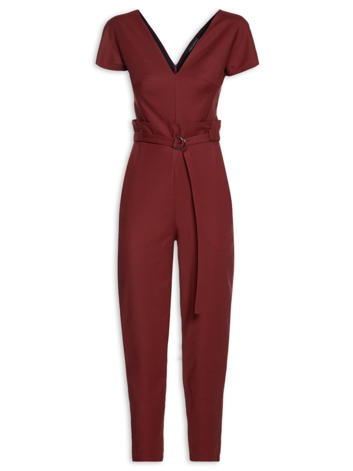 O macacão vermelho é confeccionado em tecido leve sem elasticidade. A peça justa na altura do busto e da cintura e solta no comprimento possui decote frontal e posterior em V, mangas curtas, recortes e pences nas partes posterior e frontal, bolsos posteriores embutidos, bolsos frontais modelo faca, passantes e pregas na altura da cintura nas partes posterior e frontal, forro, comprimento cropped* e fechamento posterior por zíper invisível. Acompanha cinto no mesmo tecido e cor para uso opcional.