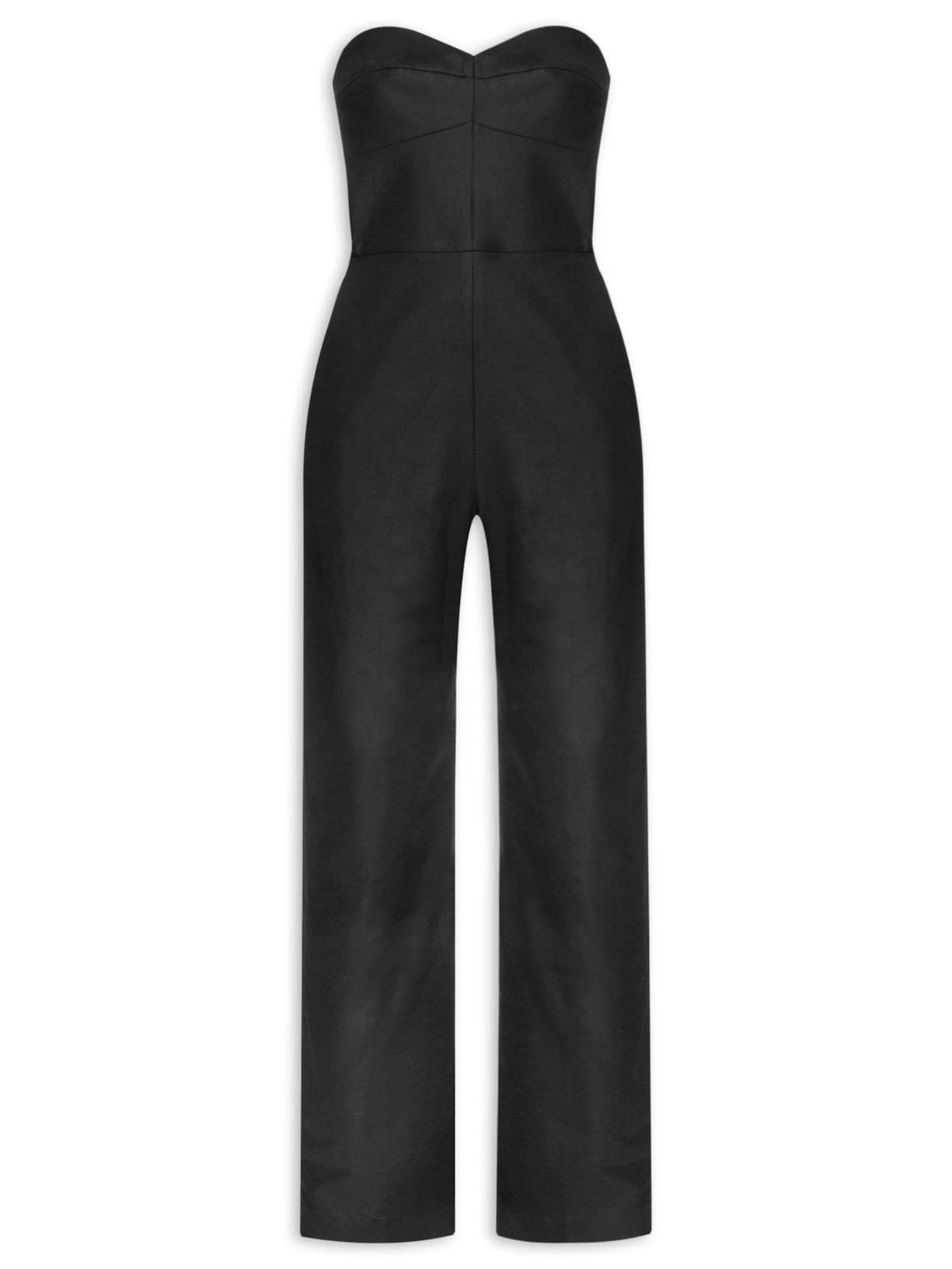 O macacão preto é confeccionado em tecido leve com baixa elasticidade. A peça de modelo tomara que caia justa no busto e na cintura e solta no comprimento possui decote coração, recortes posteriores e frontais, sem bojo, bolsos frontais modelo faca, comprimento longo e fechamento posterior por zíper invisível.