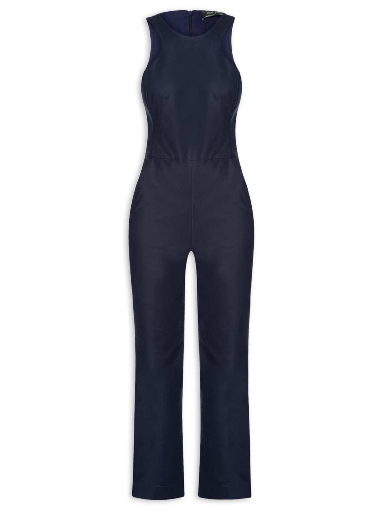 O macacão azul marinho é confeccionado em tecido leve sem elasticidade. A peça solta ao corpo de modelo semi flare possui decote redondo, alças médias, cavas estendidas, recortes frontais e posteriores, bolsos frontais de modelo faca, pences posteriores, comprimento cropped* e fechamento posterior em zíper invisível.