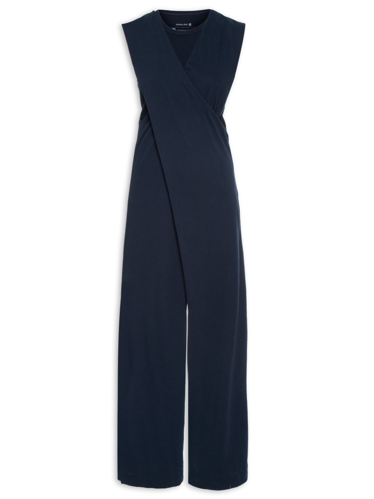 O macacão azul é confeccionado em malha com média elasticidade. A peça solta ao corpo possui decote V transpassado, alças médias, cavas estendidas e comprimento longo. Acompanha forro removível de blusa justa ao corpo que possui decote halter frontal e nadador posterior e cavas estendidas.