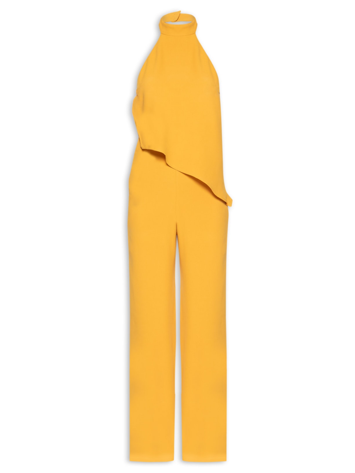 O macacão amarelo é confeccionado em crepe sem elasticidade. A peça de modelo frente única solta ao corpo possui decote trapézio, pences na altura do busto, cavas estendidas, recorte assimétrico sobreposto na parte frontal e posterior da cintura, comprimento longo e fechamento posterior por botões e lateral por zíper.