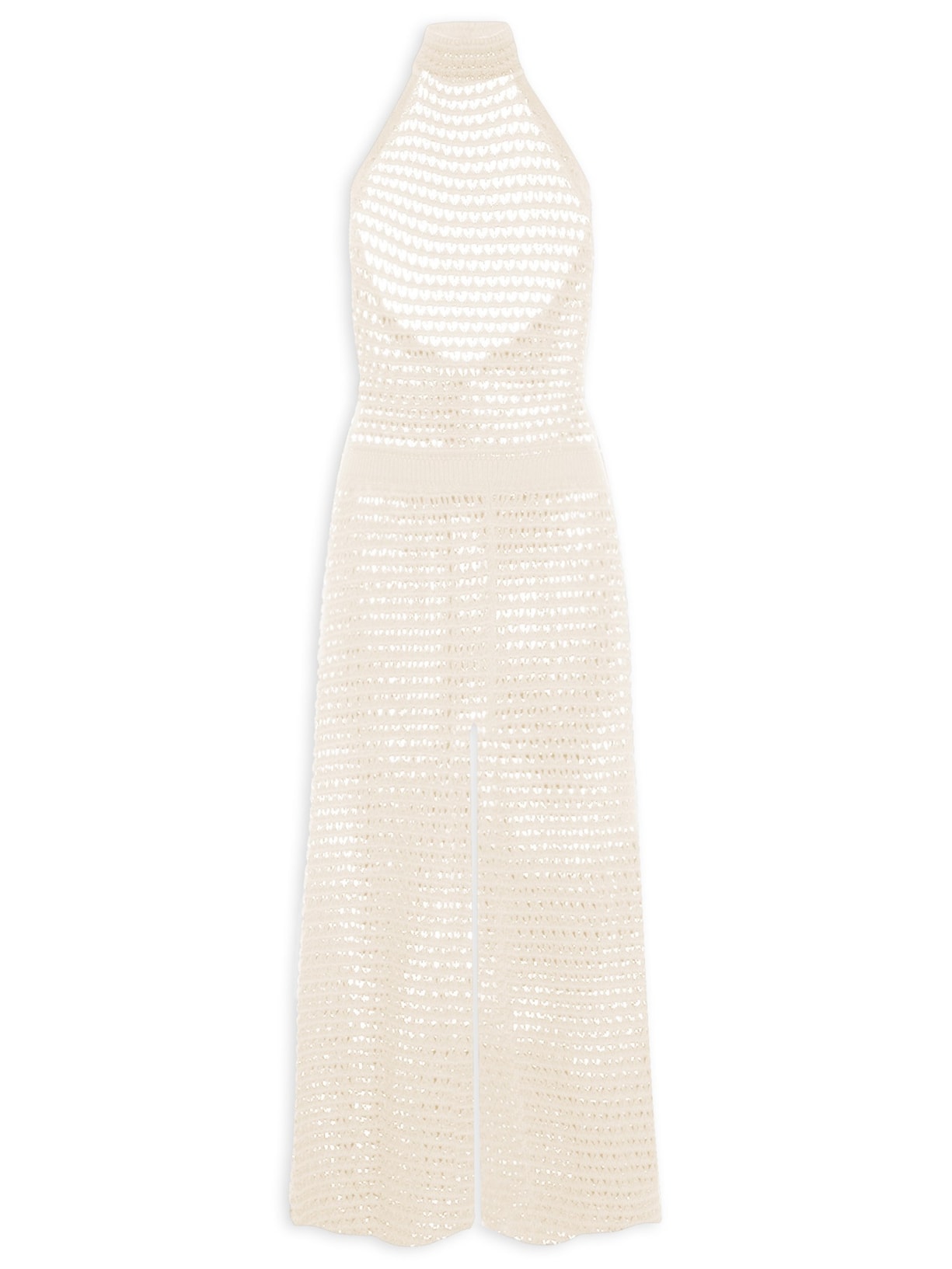 O macacão bege é confeccionado em tricot com baixa elasticidade e pontos espaçados. A peça solta ao corpo, de modelo frente única, possui gola alta com abotoamento posterior, elástico embutido na altura da cintura, transparência e comprimento cropped*.