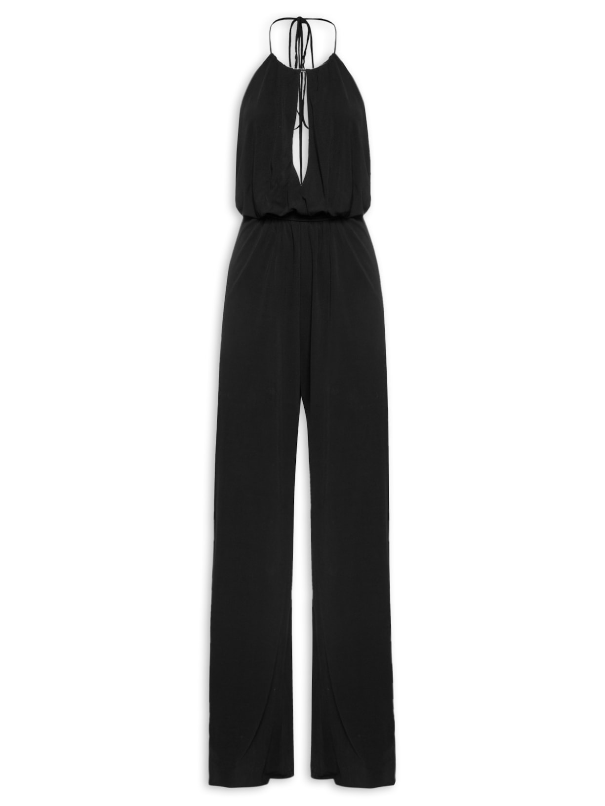 O macacão preto é confeccionado em malha com média elasticidade. A peça solta ao corpo de modelo frente única possui decote redondo, alças finas e alongadas para amarração posterior, cavas estendidas, recorte frontal vazado, recorte sobreposto na altura da cintura com efeito franzido, barra com corte a fio, parte superior em tecido duplo, sem bojo, comprimento longo e fechamento posterior em zíper invisível.