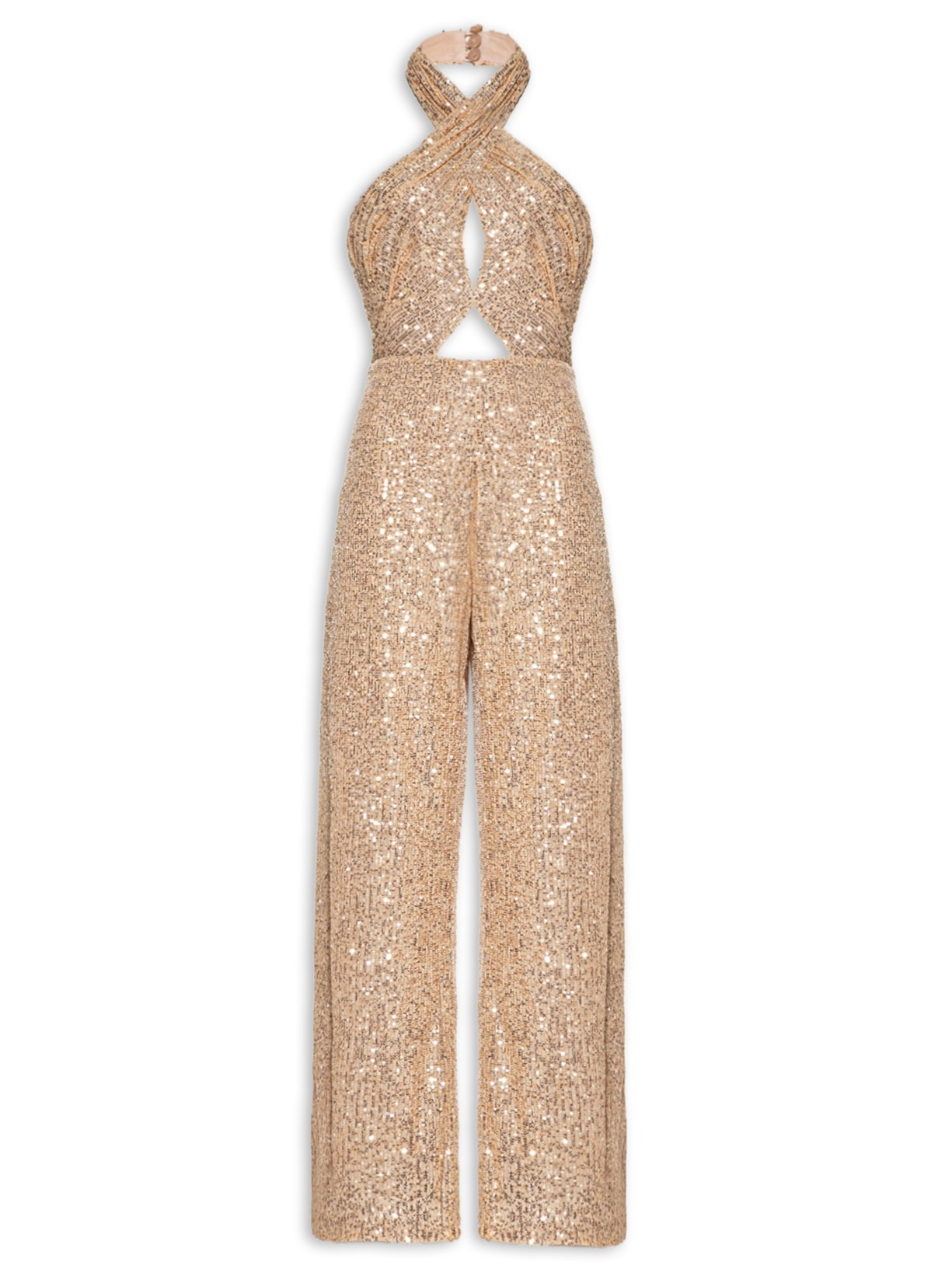 O macacão dourado é confeccionado em tecido leve com superfície em paetês e baixa elasticidade. A peça justa ao busto e solta no corpo de modelo frente única possui decote halter transpassado, alças largas com fechamento posterior por botões, cavas estendidas, recorte frontal vazado na altura da cintura, forro, comprimento longo e fechamento posterior por zíper invisível.
