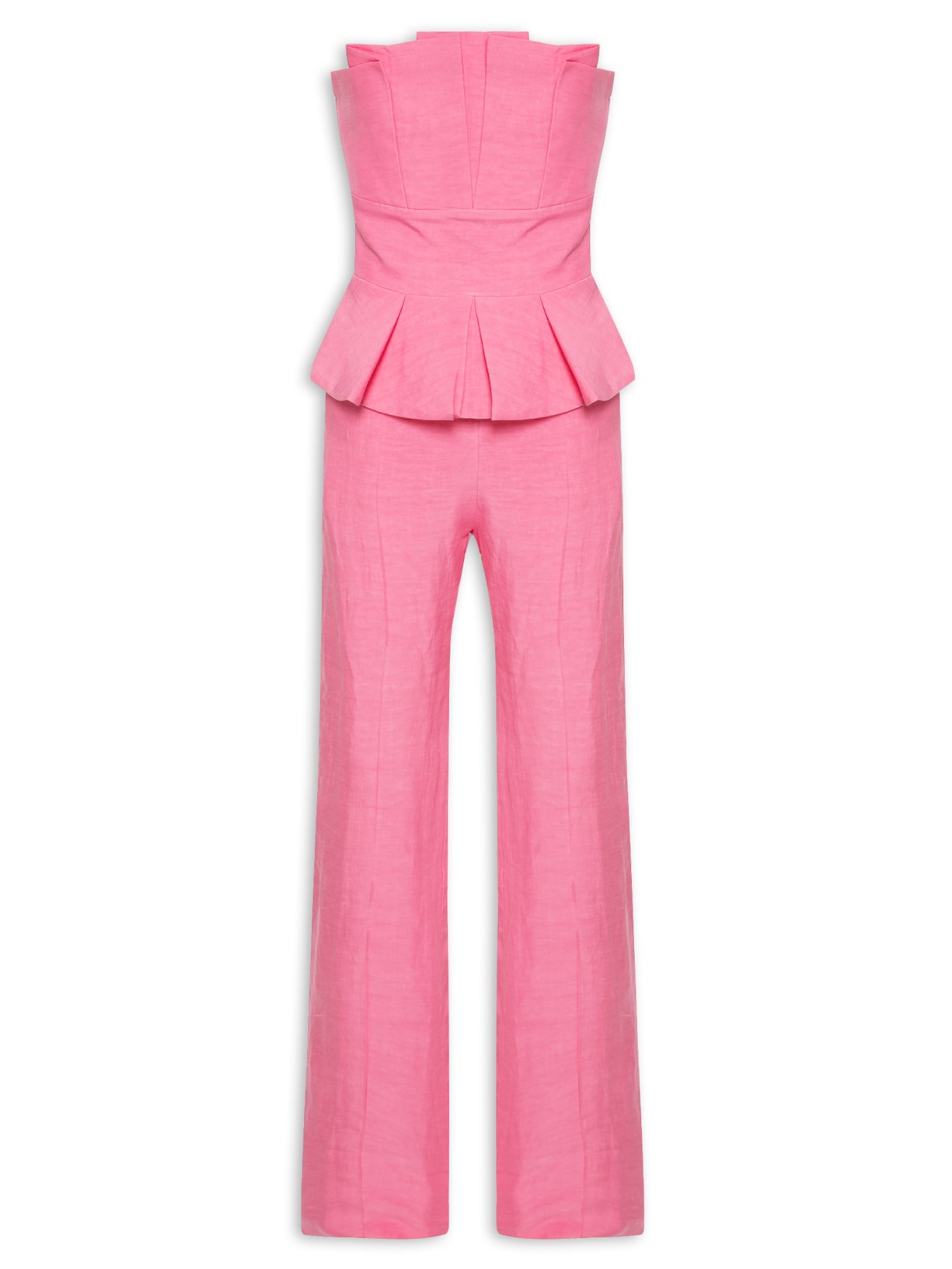 O macacão rosa é confeccionado em tecido encorpado sem elasticidade. A peça solta ao corpo, de modelo tomara que caia, possui decote reto, pregas frontais, detalhe sobreposto na altura da cintura com pregas, bolsos faca frontais, recortes frontais e posteriores com detalhe de nervura na parte inferior, comprimento longo, forro, bojo embutido e fechamento posterior por zíper metálico.