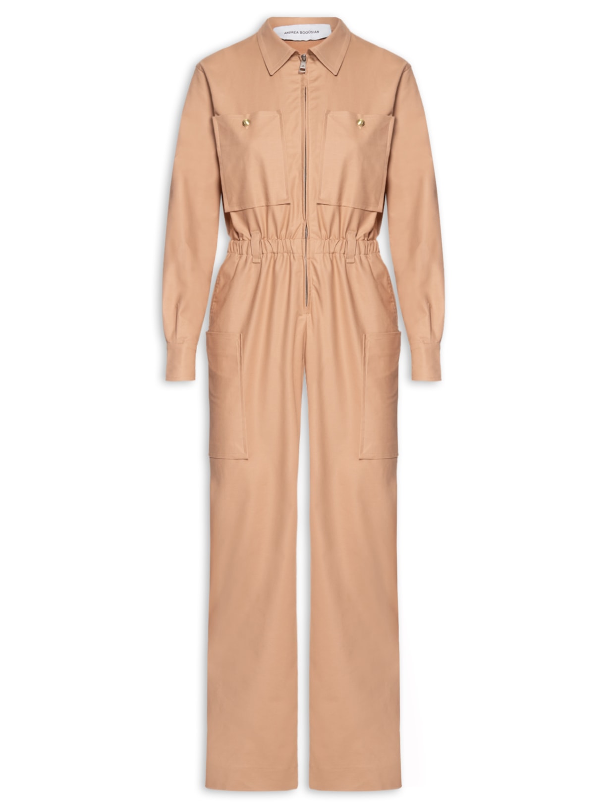 O macacão bege é confeccionado em tecido leve sem elasticidade. A peça solta ao corpo possui colarinho simples, mangas longas com abotoamento e pregas nos punhos, recorte posterior, passantes e elástico embutido na altura da cintura, bolsos frontais embutidos e na altura do busto com fechamento por botão, bolsos laterais, comprimento longo e fechamento frontal por zíper.