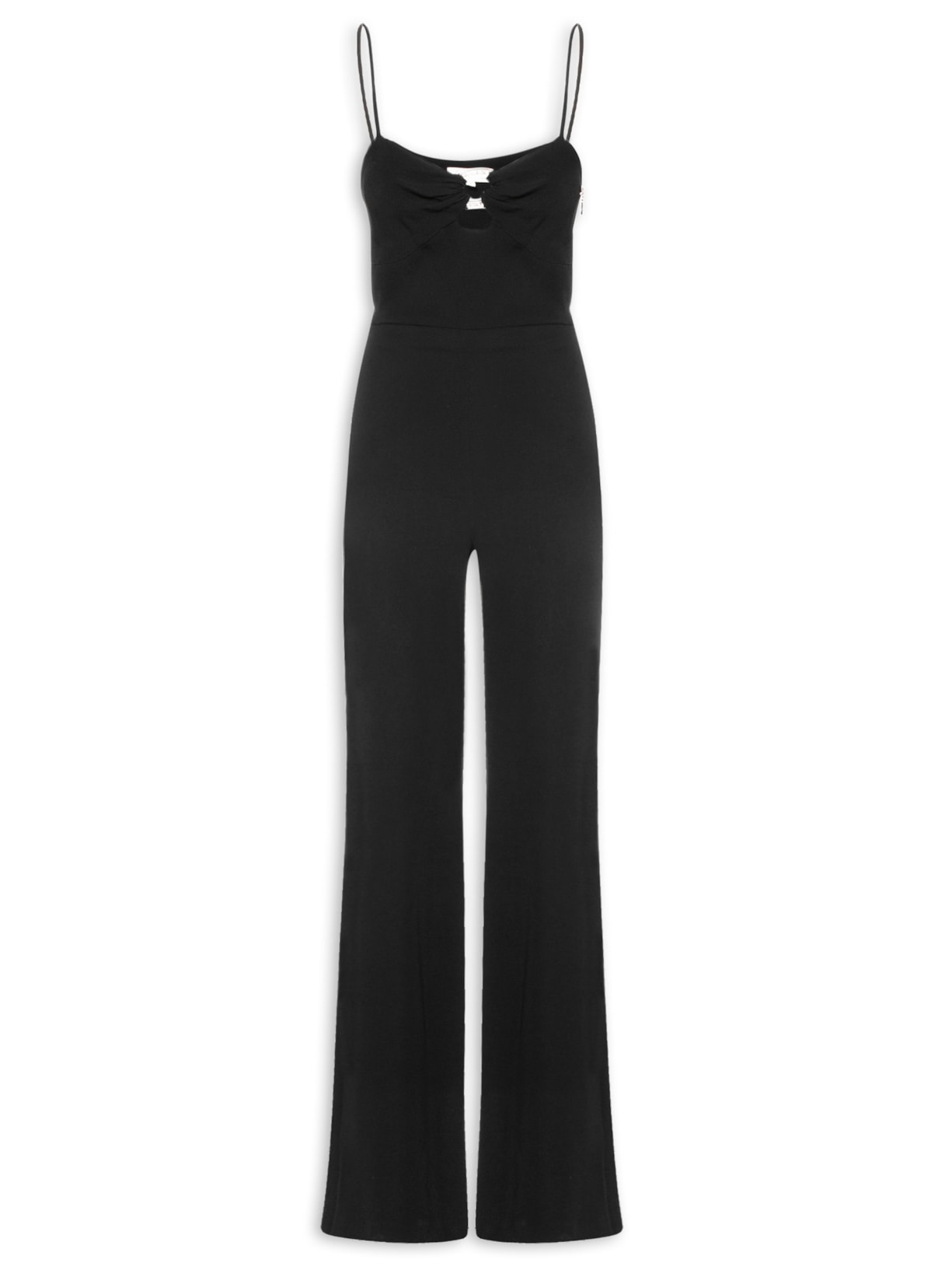 O macacão preto é confeccionado em crepe. A peça possui decote frontal U e posterior reto, alças finas, cavas regulares, recorto frontal e posterior na altura da cintura, recorte frontal vazado com argola oval transparente com aplicações de strass embutida na altura do decote, comprimento longo, shape solto, caimento reto, acabamento pespontado e fechamento lateral por zíper metálico e botão interno.