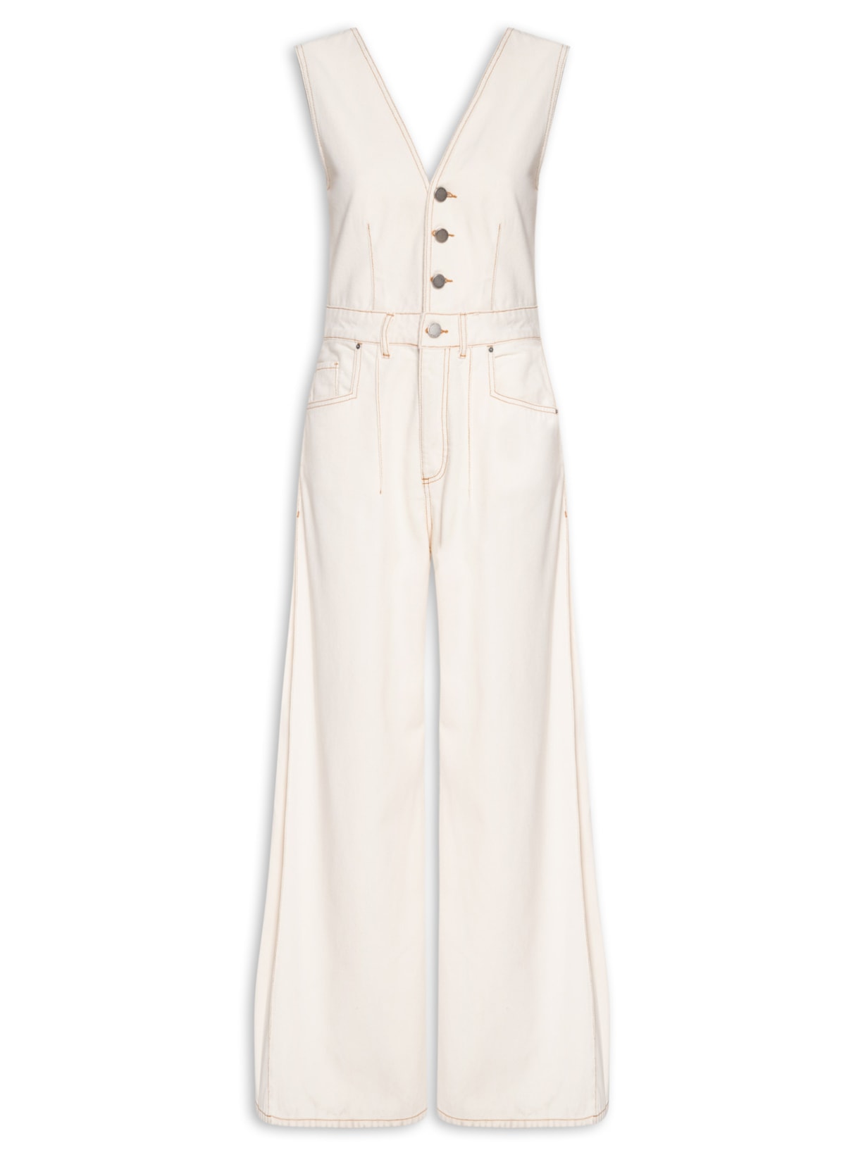 O macacão off white é confeccionado em sarja sem elasticidade. A peça solta ao corpo possui decote V frontal e posterior, alças largas, pences frontais, passantes aplicados na altura da cintura, five pockets*, recorte posterior, recorte lateral nesga, comprimento longo e fechamento frontal em zíper e botões.