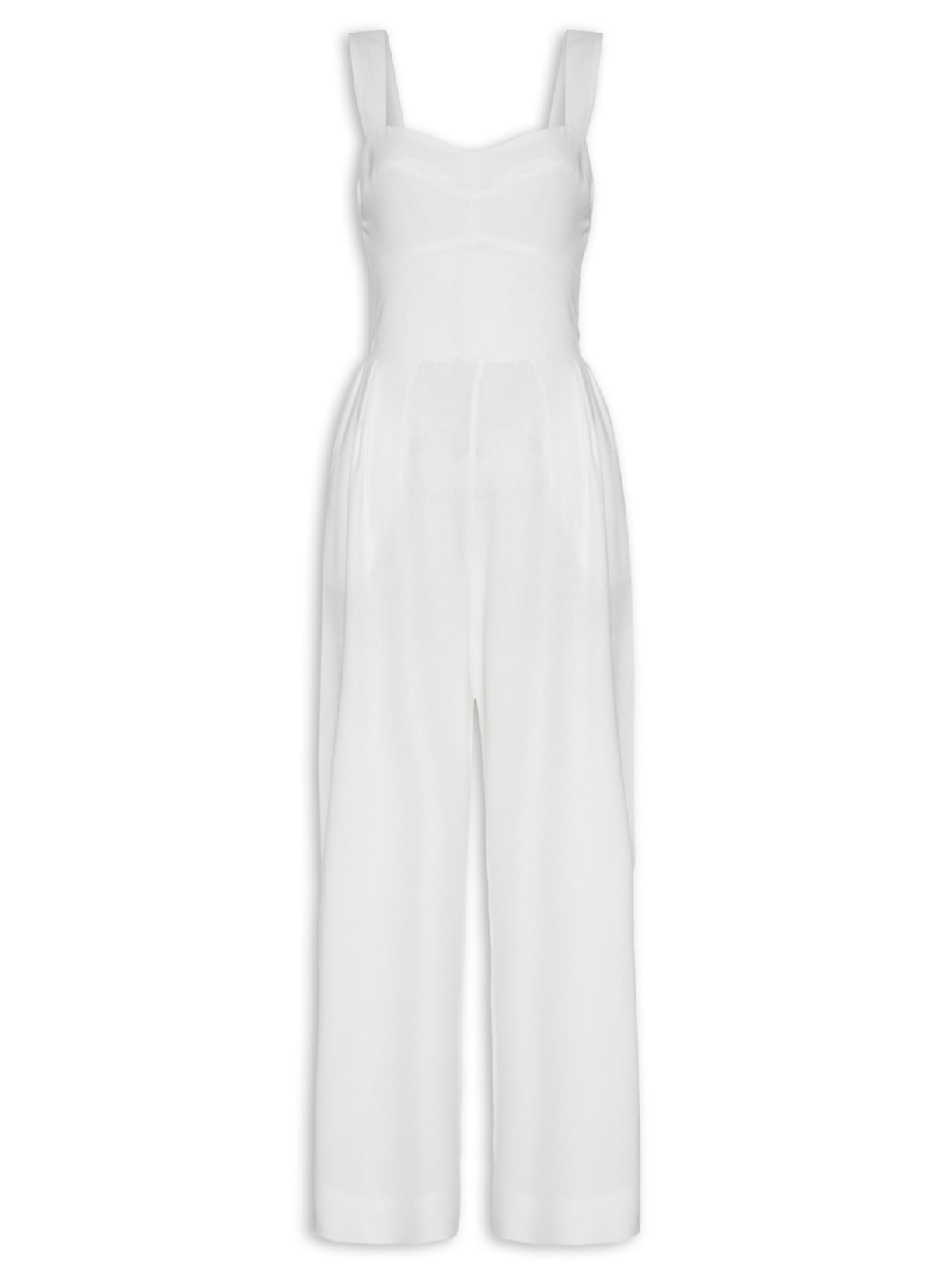 O macacão branco é confeccionado em tecido leve com toque de linho sem elasticidade. A peça justa ao corpo, possui decote coração, alças largas, recortes na parte frontal do busto, pregas frontais na altura da cintura, bolsos faca frontais, leve transparência inferior, lastex aplicado na parte posterior, bolsos posteriores barra alongada, comprimento cropped*, forro e fechamento posterior por zíper invisível.