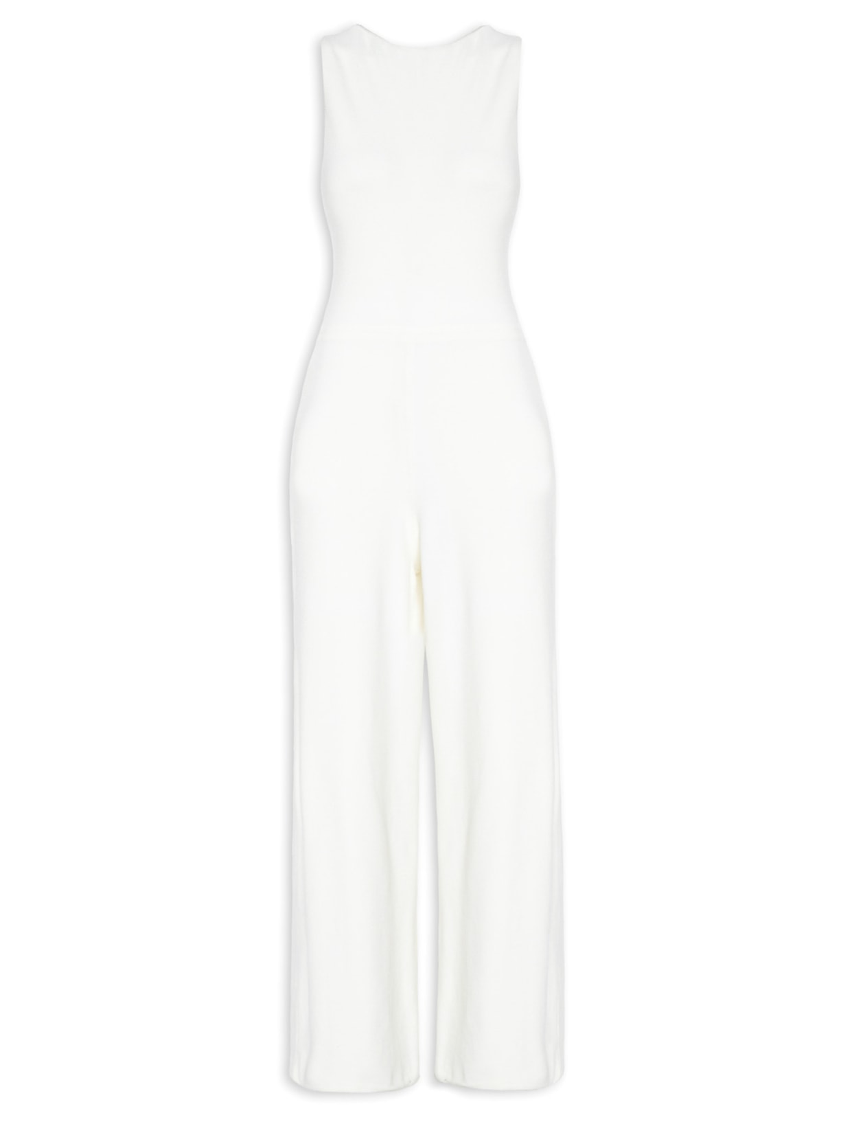 O macacão branco é confeccionado em malha creponada de média elasticidade. A peça justa ao busto e solta no comprimento possui decote redondo, alças médias cruzadas na parte posterior, recortes frontais, tecido duplo, comprimento longo e fechamento posterior por zíper invisível.