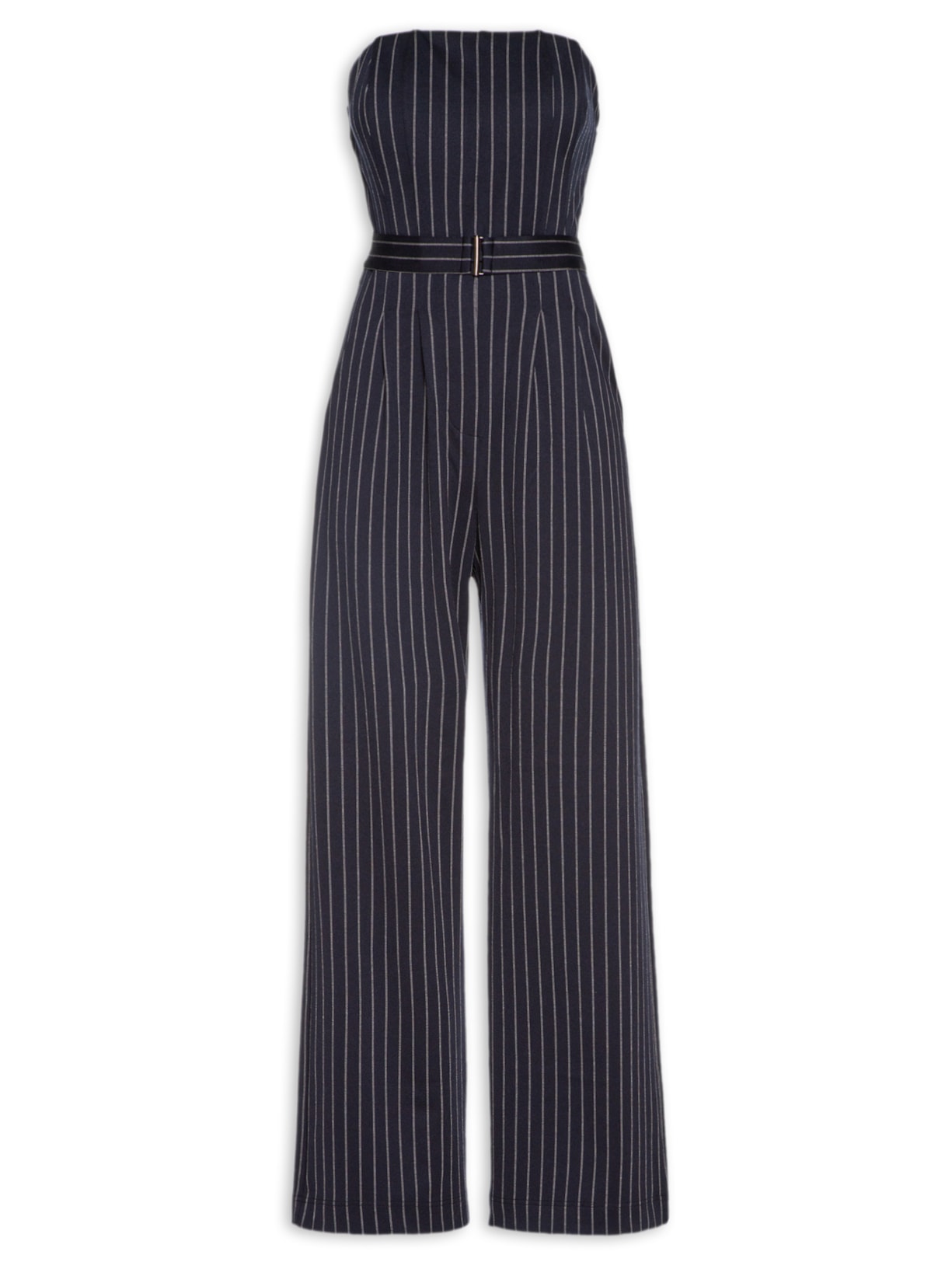 O macacão azul marinho é confeccionado em tecido leve de baixa elasticidade. A peça justa ao busto e solta no comprimento de modelo tomara que caia possui decote reto, barbatanas embutidas na parte superior, bolsos frontais de modelo faca, pregas frontais, pences posteriores, bolsos posteriores decorativos, padronagem listrada na cor off white, comprimento longo e fechamento lateral por zíper.