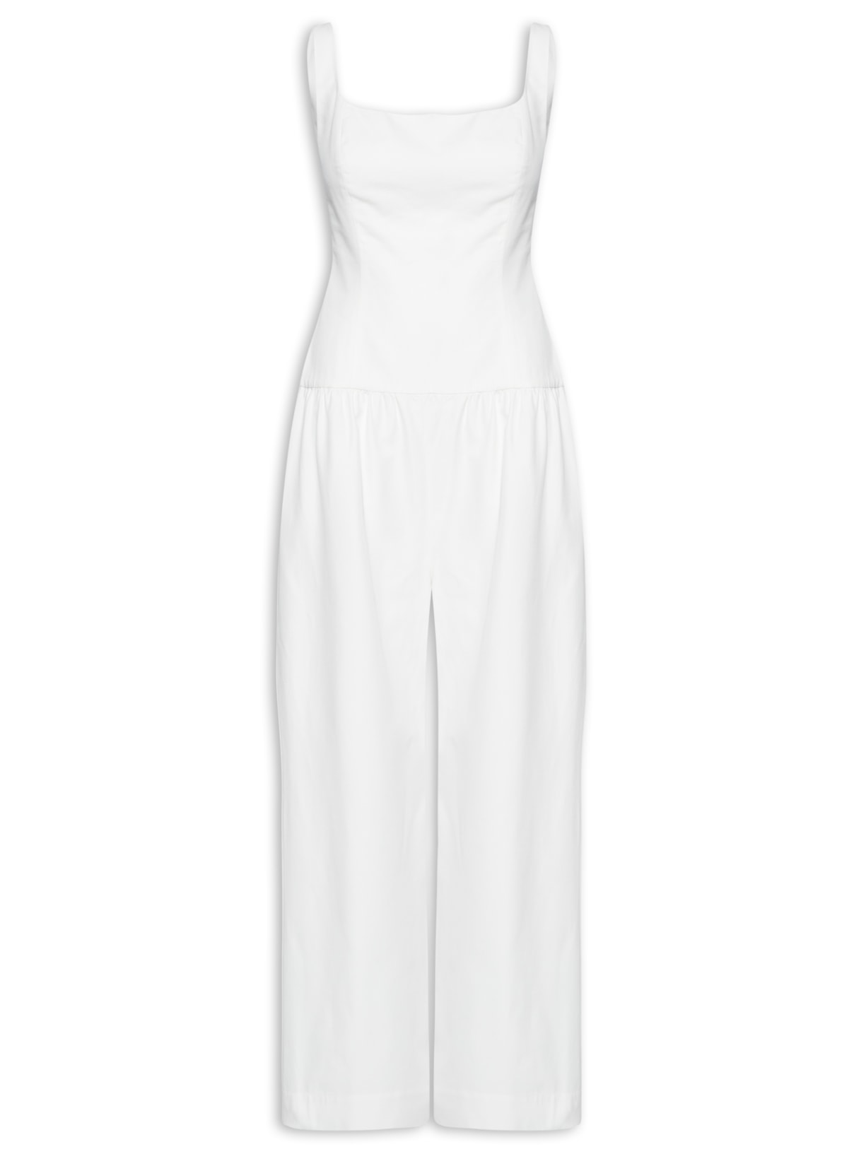O macacão off white é confeccionado em sarja sem elasticidade. A peça justa na altura do busto e da cintura e solta no comprimento possui decote posterior e frontal em U, alças médias, cavas estendidas, recortes posteriores e frontais, sem bojo, recorte com detalhe de franzido na altura da cintura, comprimento longo e fechamento lateral por zíper invisível.