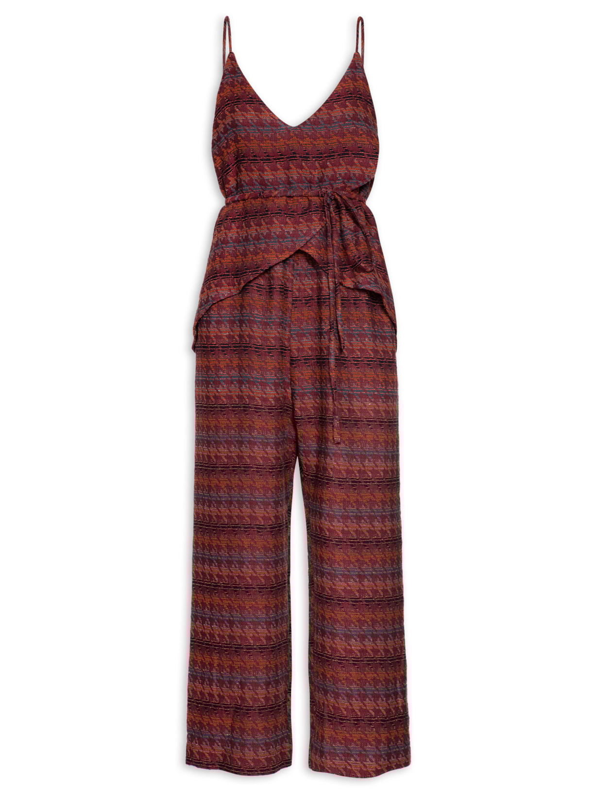 O macacão vinho é confeccionado em jacquard. A peça possui decote frontal e posterior em V profundo, alças finas, cavas estendidas, recortes frontais e posteriores sobrepostos, padronagem pied de poule em cores contrastantes, comprimento longo, shape solto e fechamento lateral por botões e zíper metalizado. Acompanha cordão na mesma padronagem e tecido para uso opcional.