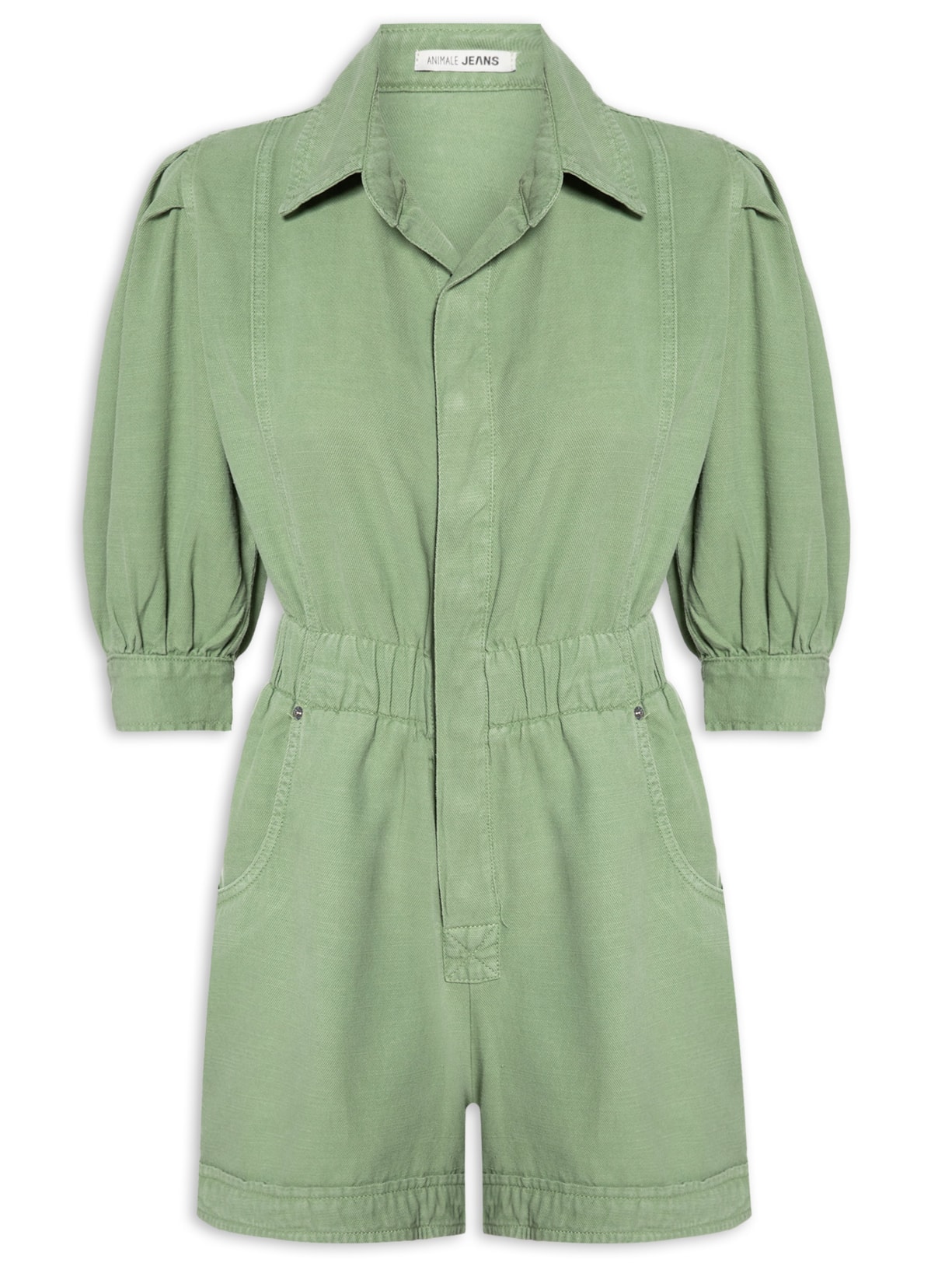 O macacão verde é confeccionado por sarja sem elasticidade. A peça solta ao corpo possui colarinho simples, mangas 3/4 com pregas e ajuste nos punhos por botão, recortes frontais e posteriores, bolsos frontais no modelo faca, elástico embutido na cintura, tag da marca metalizada aplicada na parte posterior, fechamento por botões frontais e comprimento curto.