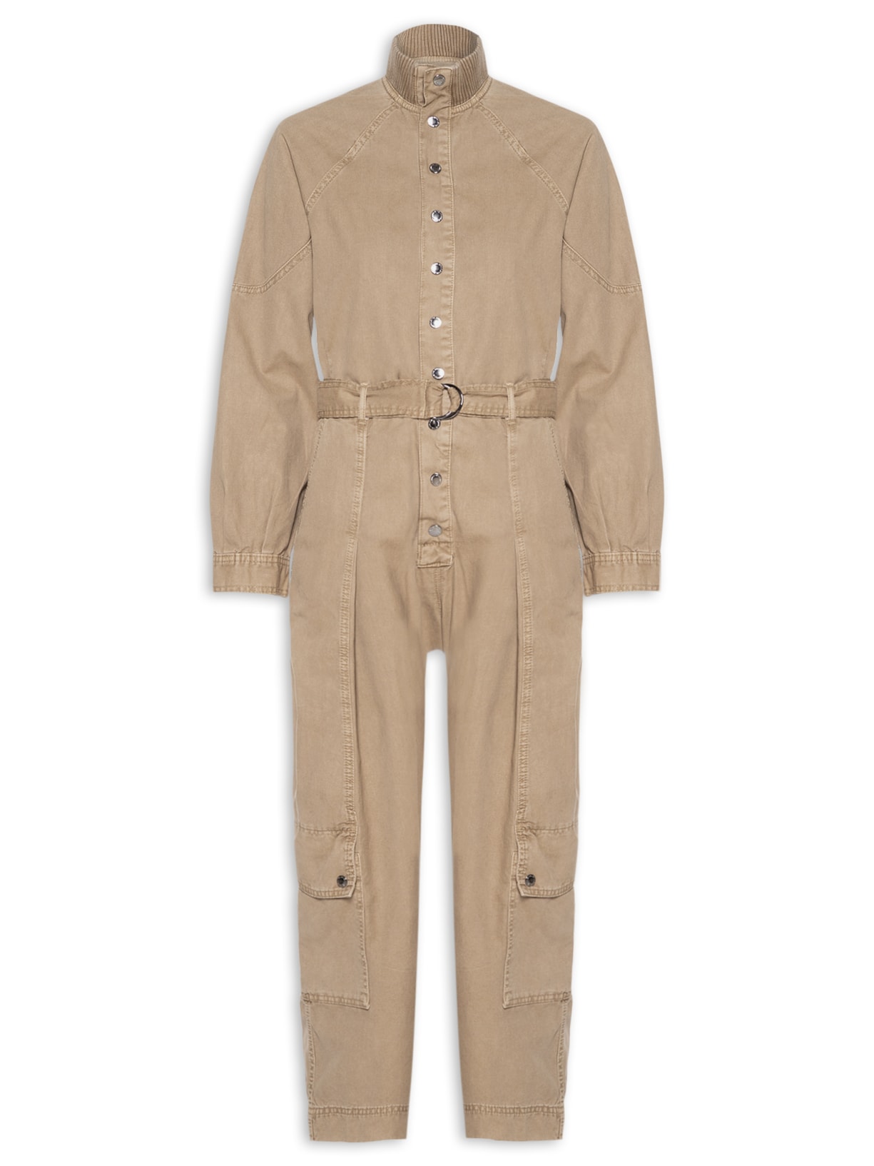 O macacão marrom é confeccionado em sarja sem elasticidade. A peça solta ao corpo possui gola alta com acabamento canelado, mangas longas raglan com abotoamento de pressão nos punhos, recortes frontais e posteriores, passantes aplicados na altura da cintura, bolsos frontais de modelo faca, pences posteriores, bolsos posteriores, bolsos laterais de modelo cargo com fechamento em botões de pressão, comprimento longo e fechamento frontal em botões de pressão.