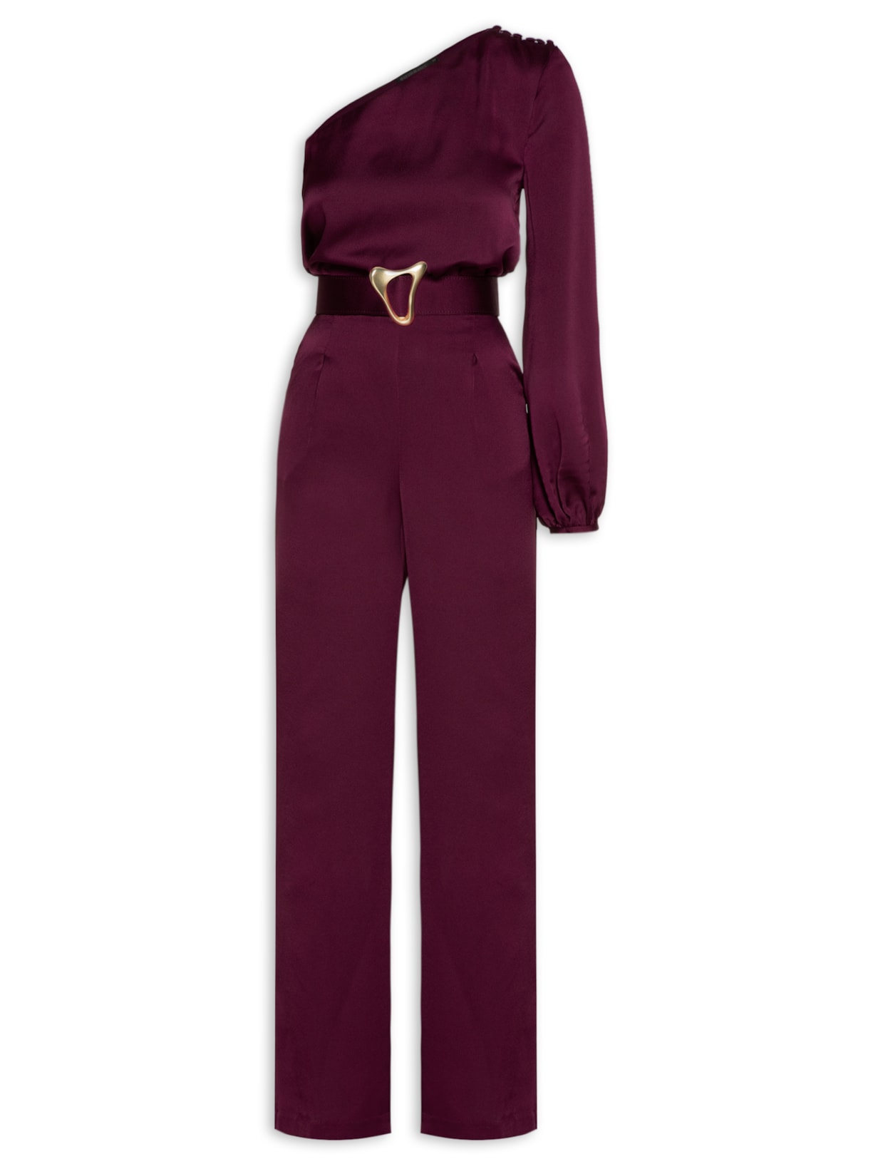 O macacão vinho é confeccionado em tecido leve com superfície texturizada e acetinada. A peça possui decote ombro único com logo metalizado da marca na parte posterior, manga longa com detalhes de franzidos e abotoamento nos punhos, fechamento por botões forrados no ombro, recorte com detalhes de franzidos e passantes aplicados na altura da cintura, recorte posterior sobreposto com detalhe de fendas laterais, pregas frontais, bolsos frontais de modelo faca, pences posteriores, comprimento longo, shape solto e fechamento posterior por zíper invisível. Acompanha cinto na mesma cor com aviamento metalizado assimétrico frontal e fechamento posterior por botões de pressão para uso opcional.
