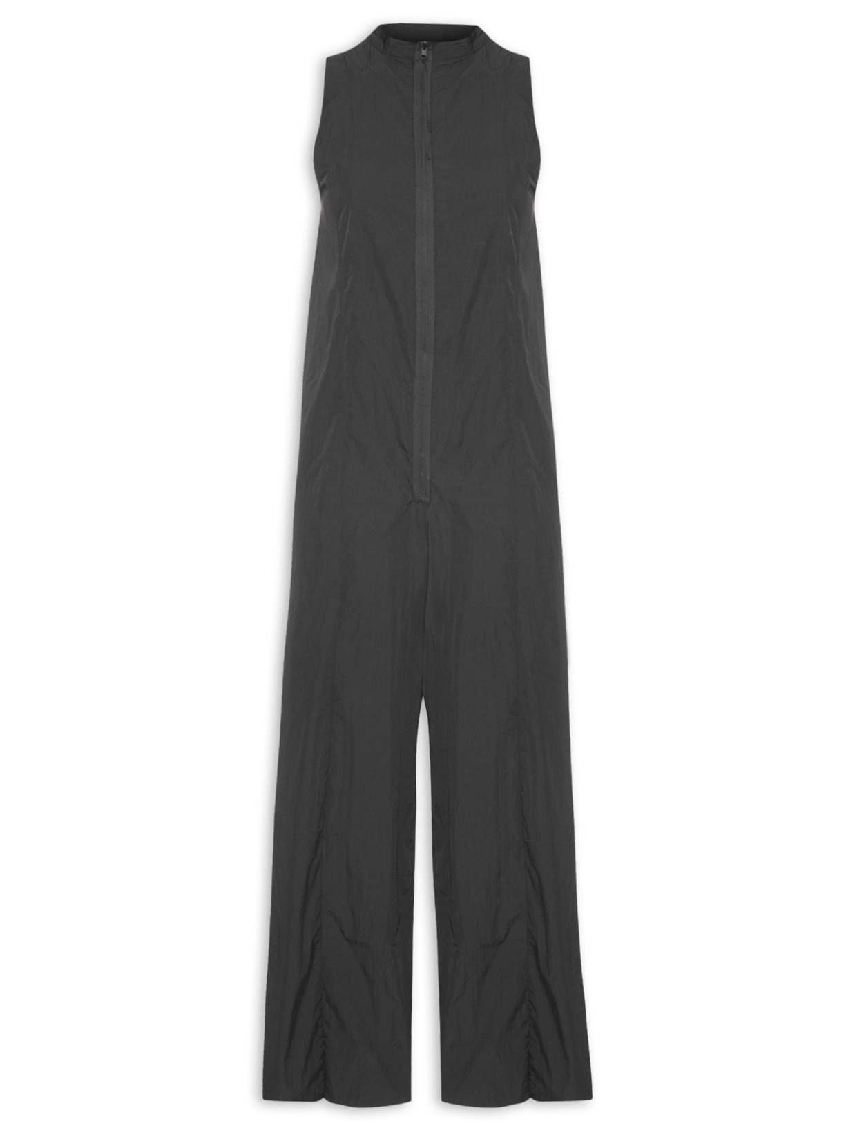 O macacão preto é confeccionado em tecido leve com efeito amassado de baiza elasticidade. A peça solta ao corpo, possui gola alta, cavas estendidas, recortes frontais e posteriores, acabamento por corte a fio, comprimento longo, e fechamento frontal por zíper.