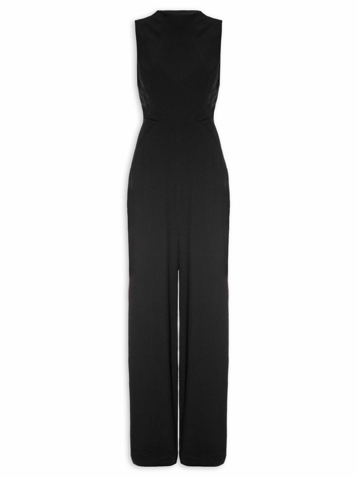 O macacão preto é confeccionado em crepe. A peça possui decote redondo, alças largas, cavas regulares, recortes posteriores sobrepostos, recorte posterior vazado, recortes frontais, pences posteriores, comprimento longo, shape solto, caimento reto, acabamento pespontado e fechamento posterior por botões e zíper invisível.