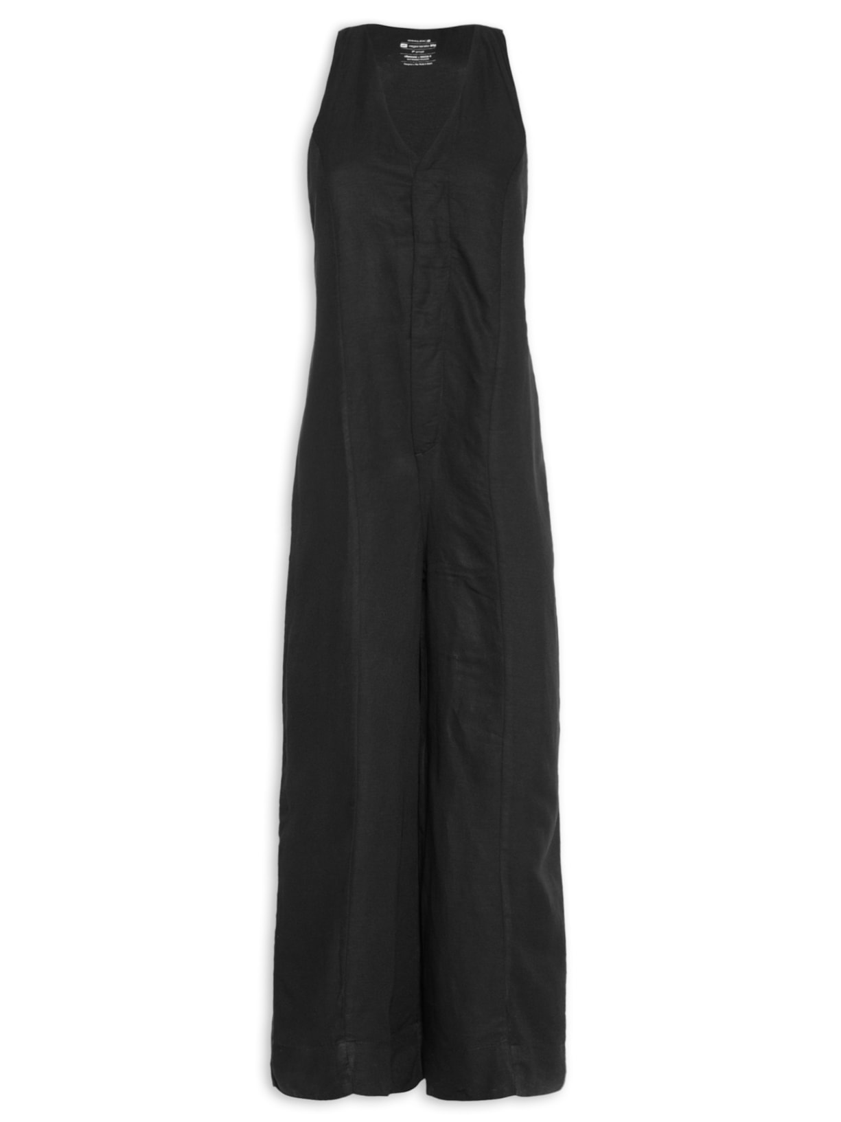 O macacão preto é confeccionado em tecido leve sem elasticidade. A peça solta ao corpo possui decote V, cavas estendidas, recortes frontais e posteriores, comprimento longo, fechamento posterior em botões.