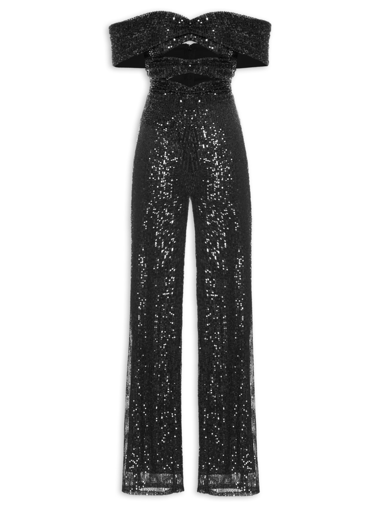 O macacão preto é confeccionado em tecido leve com superfície em paetês. A peça possui decote ombro à ombro, recorte frontal e posterior sobrepostos com alças médias, detalhes frontais de franzidos, recortes frontais vazados, recorte frontal e posterior na altura da cintura, forro, comprimento longo, shape solto e fechamento posterior por zíper invisível.