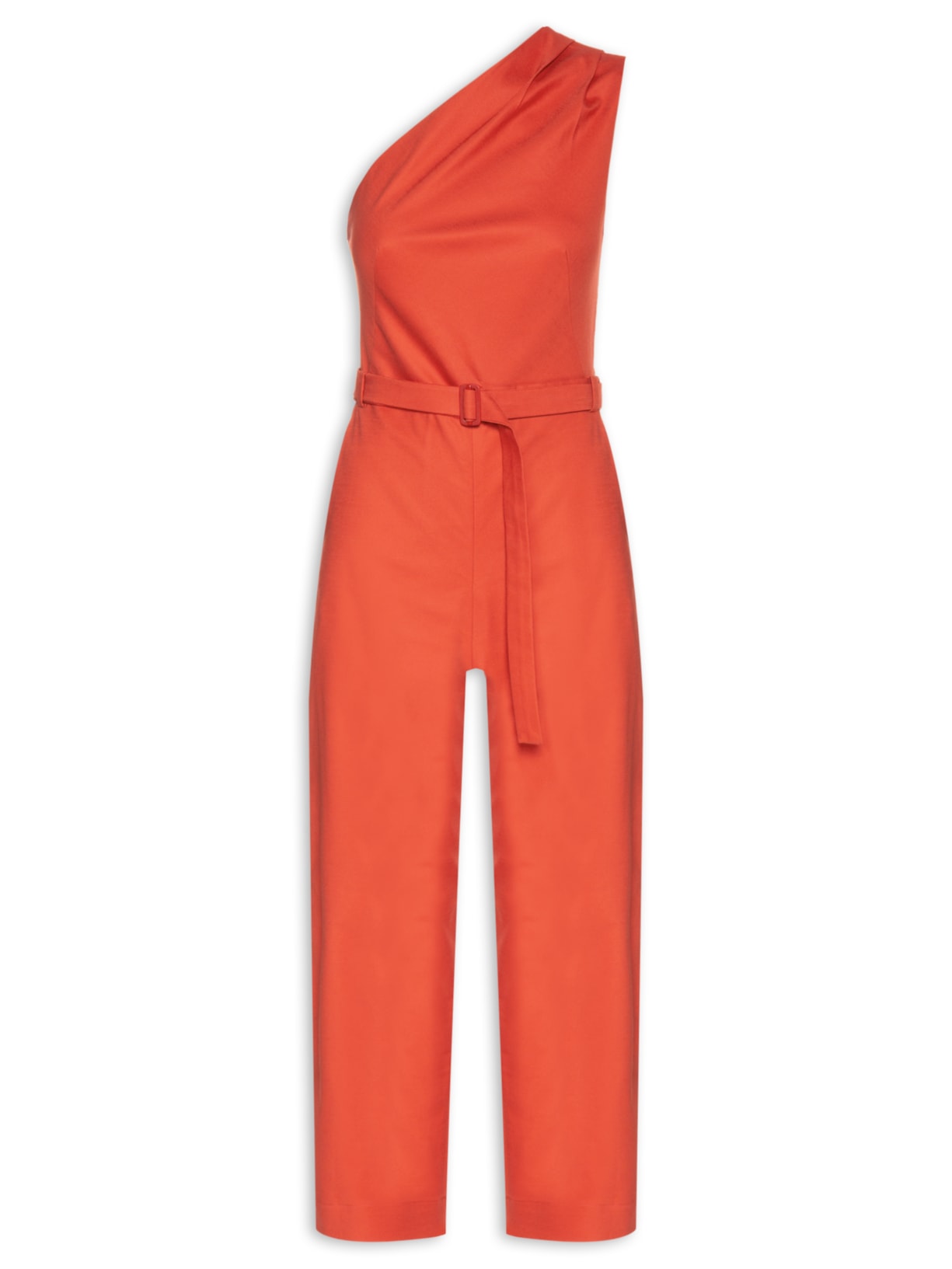 O macacão vermelho é confeccionado em tecido leve com baixa elasticidade. A peça solta ao corpo possui decote ombro único, recortes frontais, tecido sobreposto na cintura com passantes e fechamento posterior por colchetes, bolsos frontais modelo faca, bolsos posteriores embutidos, recortes frontais e posteriores e fechamento lateral por zíper invisível. Acompanha cinto do mesmo tecido e cor para uso opcional.