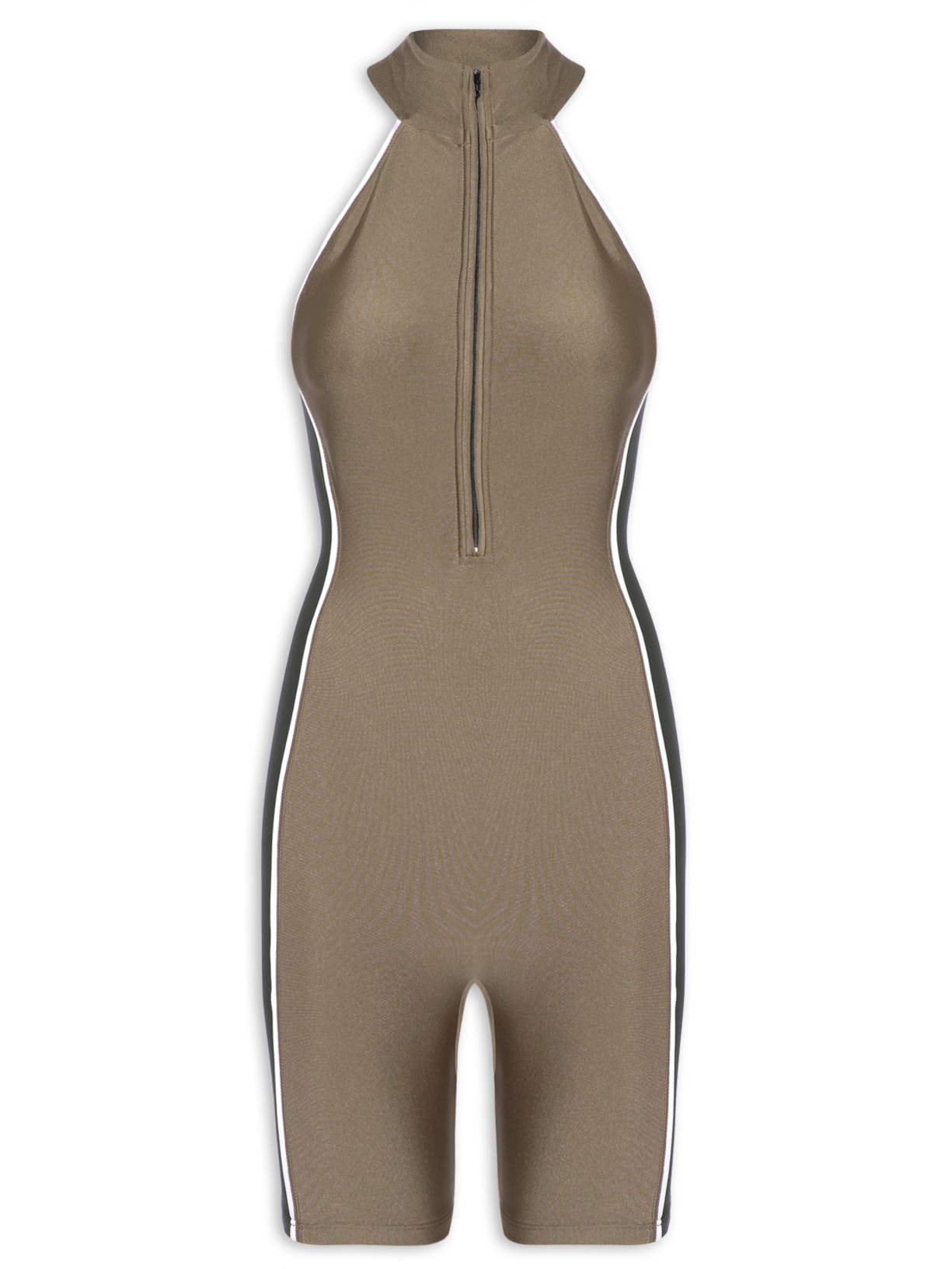 O macaquinho marrom é confeccionado em malha com superfície levemente brilhante e alta elasticidade. A peça possui gola alta, decote trapézio, logo da marca aplicado na parte posterior, recortes laterais e posterior em cor contrastante, aplicação lateral e posterior de viés em cor contrastante, comprimento curto e fechamento frontal por zíper.
