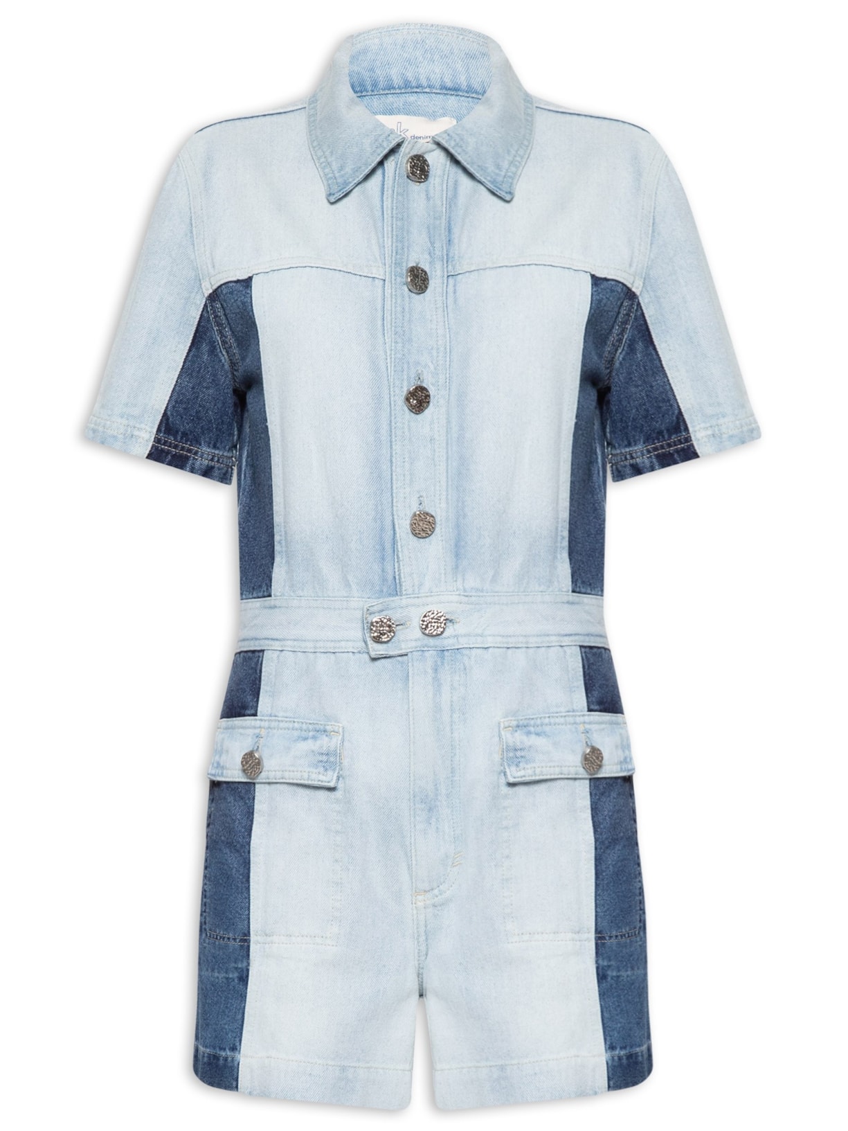 O macaquinho azul é confeccionado em sarja com lavagem jeans e sem elasticidade. A peça possui colarinho clássico, mangas curtas, cós com tag da marca aplicada em tom contrastante, bolsos frontais com fechamento em botão, recortes em tons contrastantes, comprimento curto e fechamento frontal em zíper e botões.