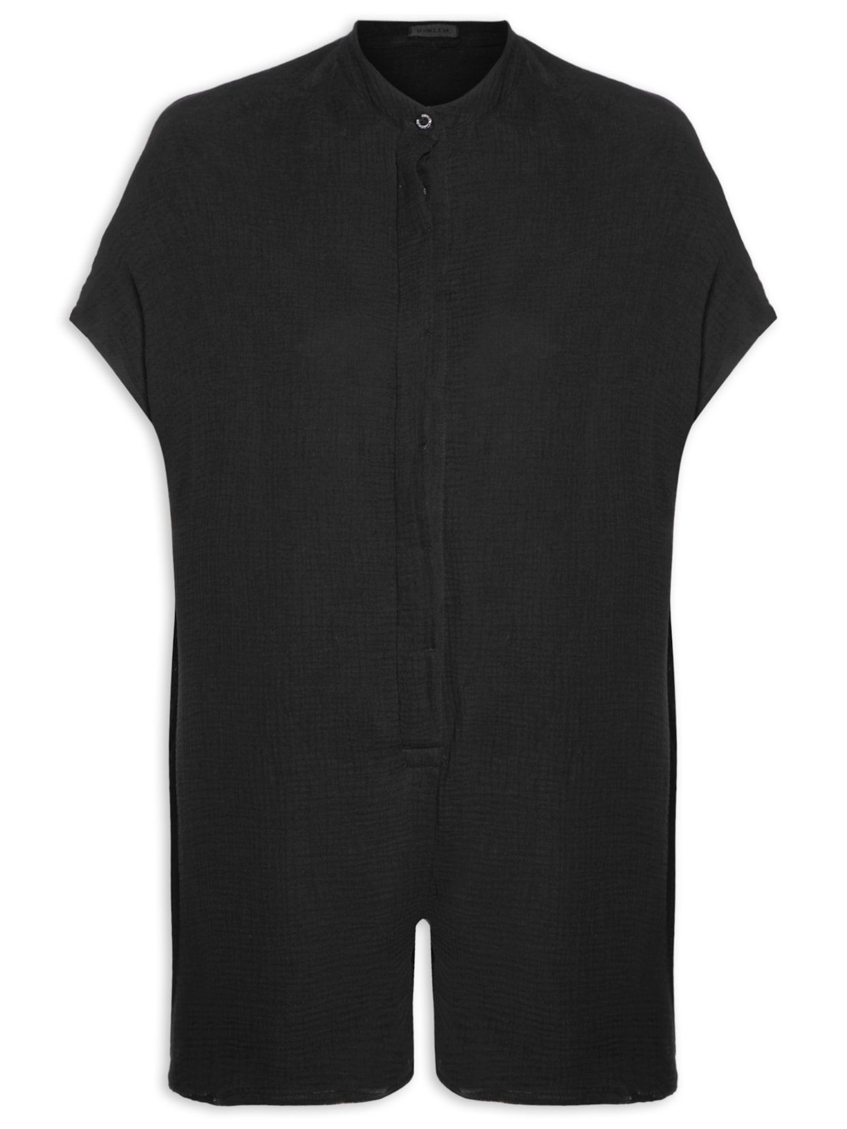 O macaquinho preto é confeccionado em tecido leve sem elasticidade. A peça solta ao corpo possui colarinho padre, mangas curtas, dois bolsos laterais, forro, comprimento curto, barra em corte a fio, e fechamento frontal por botões.