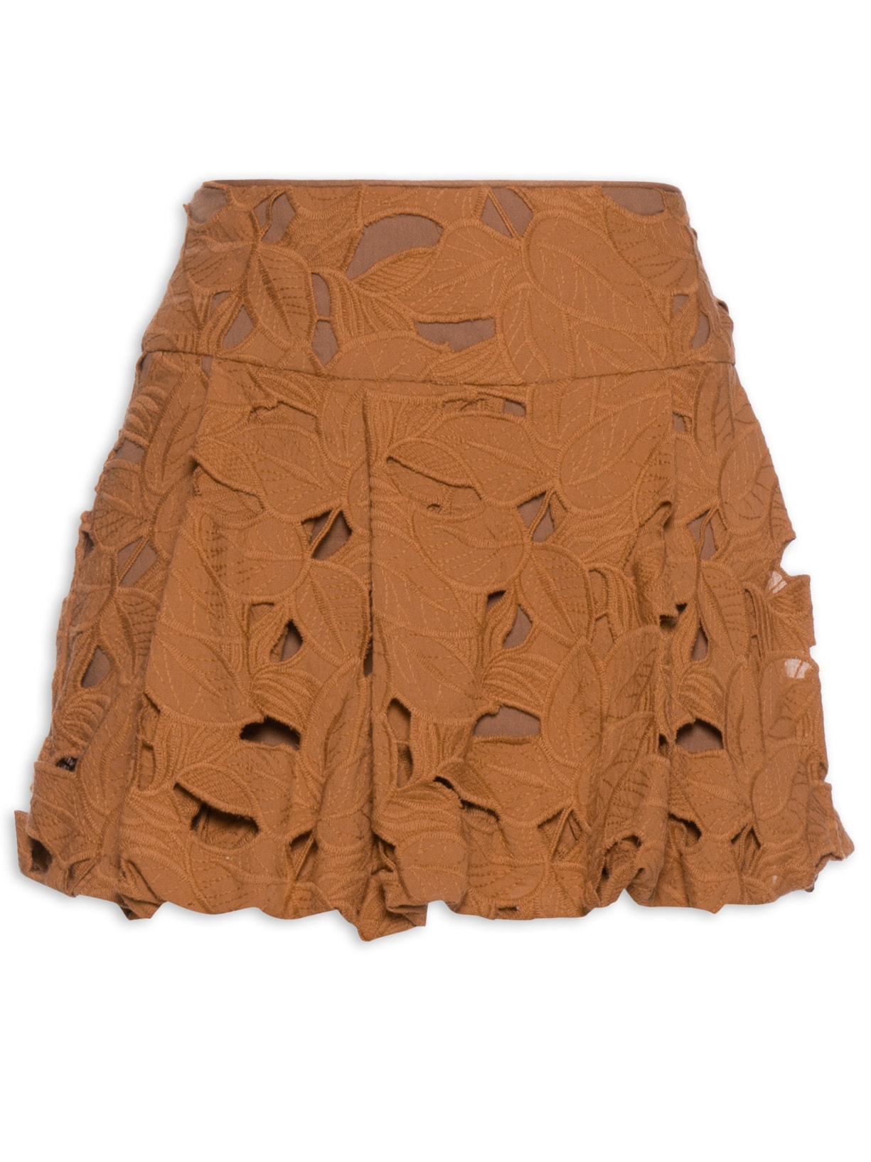 A mini saia marrom é confeccionada em laise sem elasticidade. A peça solta ao corpo possui cintura média, pregas frontais e posteriores00, barra com efeito balonê, forro, comprimento mini e fechamento posterior por zíper invisível.
