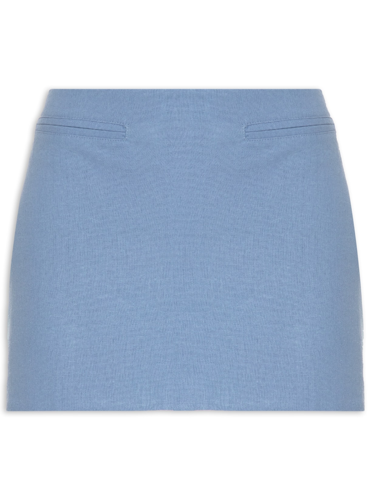 A mini saia azul é confeccionada em linho misto. A peça possui cintura baixa, bolsos frontais decorativos, pences posteriores, forro, comprimento mini, shape justo e fechamento posterior por zíper invisível.