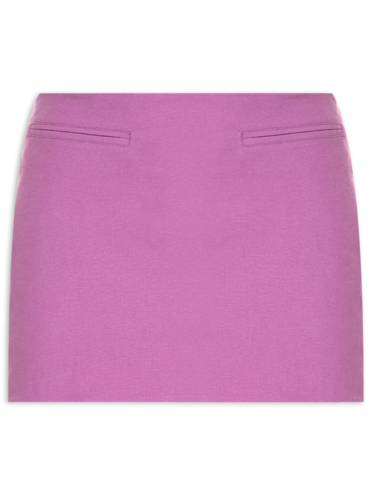 A mini saia roxa é confeccionada em linho misto. A peça possui cintura baixa, bolsos frontais decorativos, pences posteriores, forro, comprimento mini, shape justo e fechamento posterior por zíper invisível.