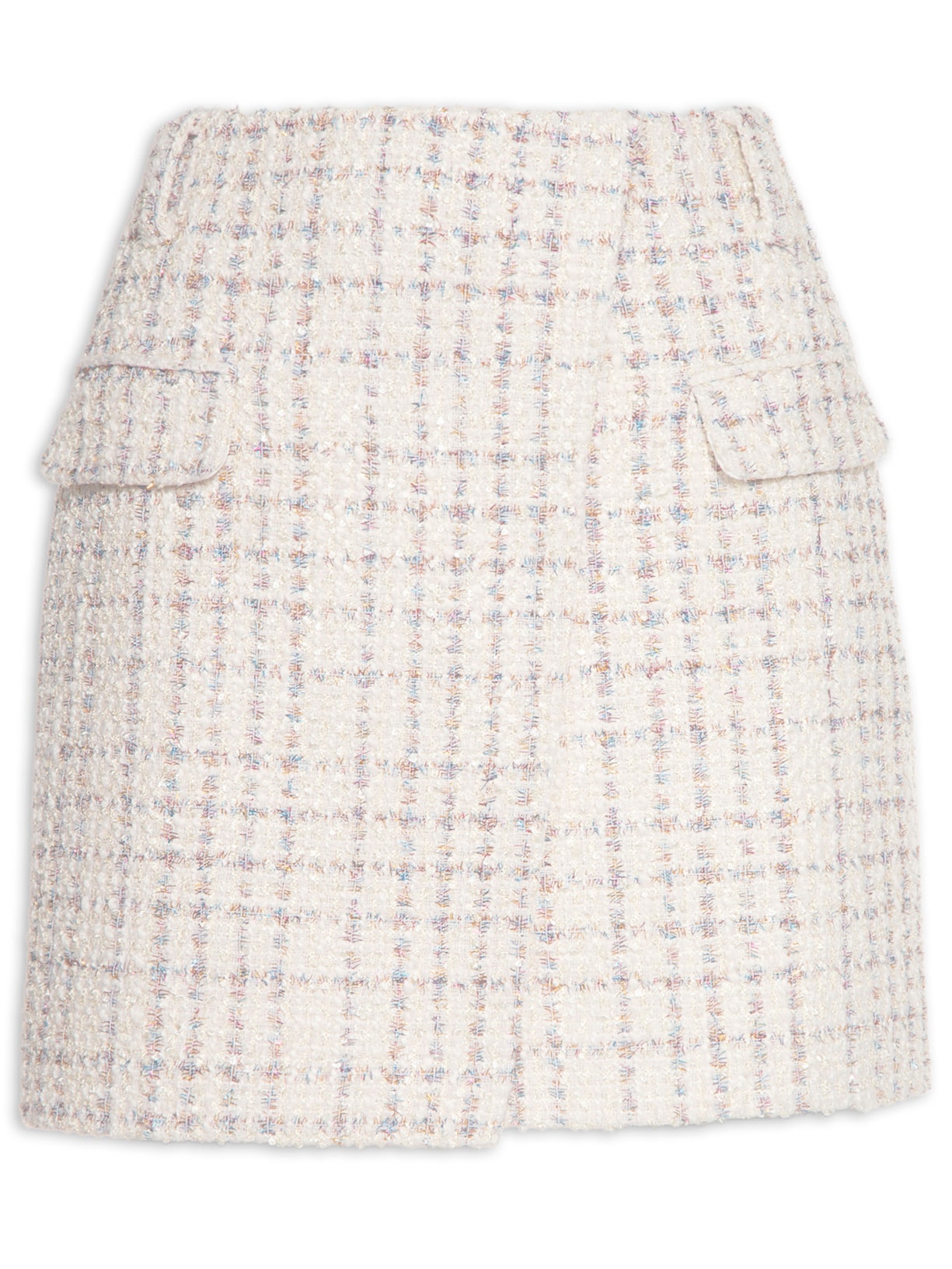 A mini saia off white é confeccionada em tweed. A peça possui cintura alta, passantes aplicados no cós, recorte sobreposto aplicado na parte frontal, bolsos frontais decorativos, comprimento curto, shape solto, caimento reto, acabamento pespontado e fechamento posterior por zíper.