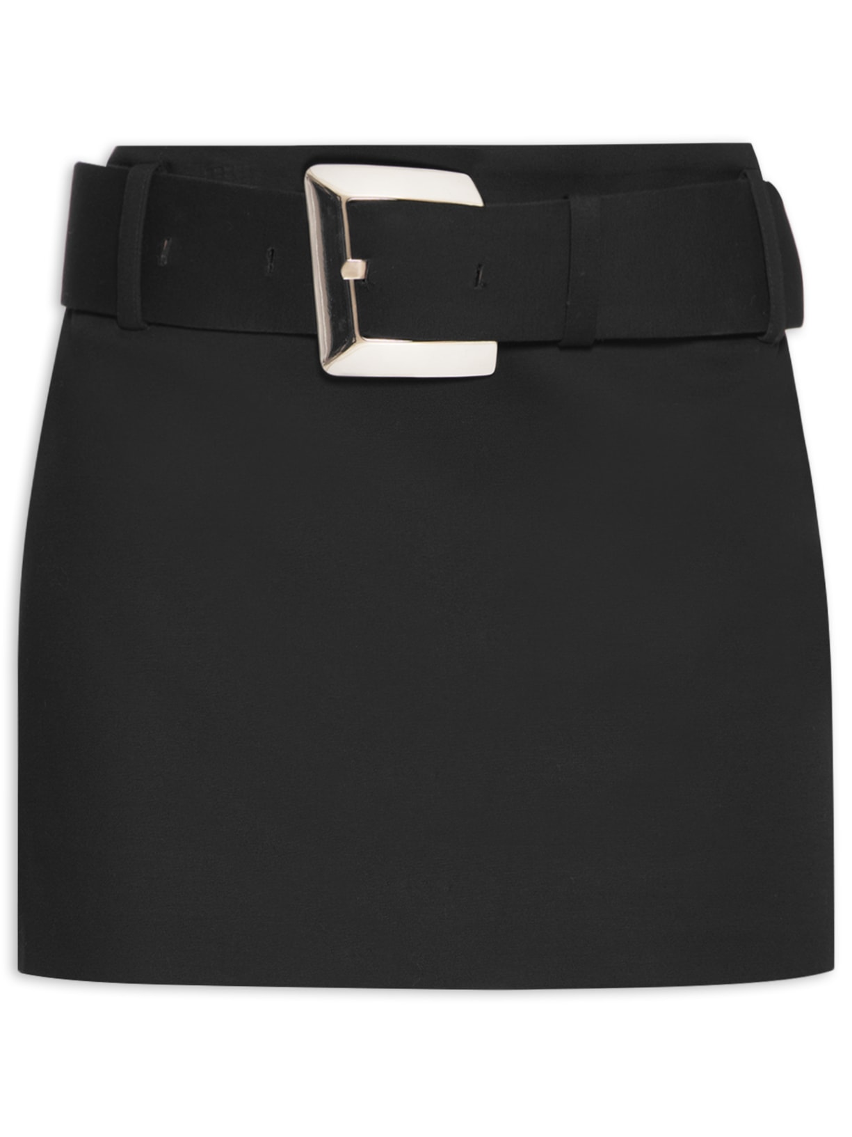 A saia preta é confeccionada em tecido leve com baixa elasticidade. A peça solta ao corpo possui cintura alta, cós com passantes, forro, comprimento mini e fechamento lateral por zíper invisível. Acompanha cinto para uso opcional com espessura larga e fechamento por fivela metálica regulável.