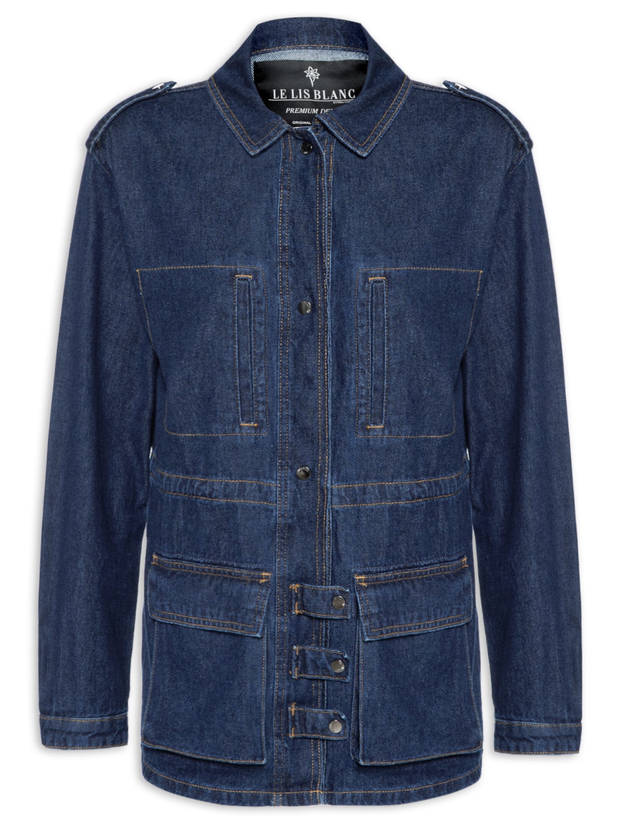 A parka jeans da Le Lis em lavagem escura é a peça-chave para composições urbanas e modernas. Use sobre regata básica e short jeans coordenado para um visual all denim com toque fashionista. O shape utilitário e os detalhes pespontados equilibram casualidade e sofisticação. Finalize com slingback de bico fino e brincos marcantes para um look versátil, ideal para passeios urbanos com estilo e personalidade.