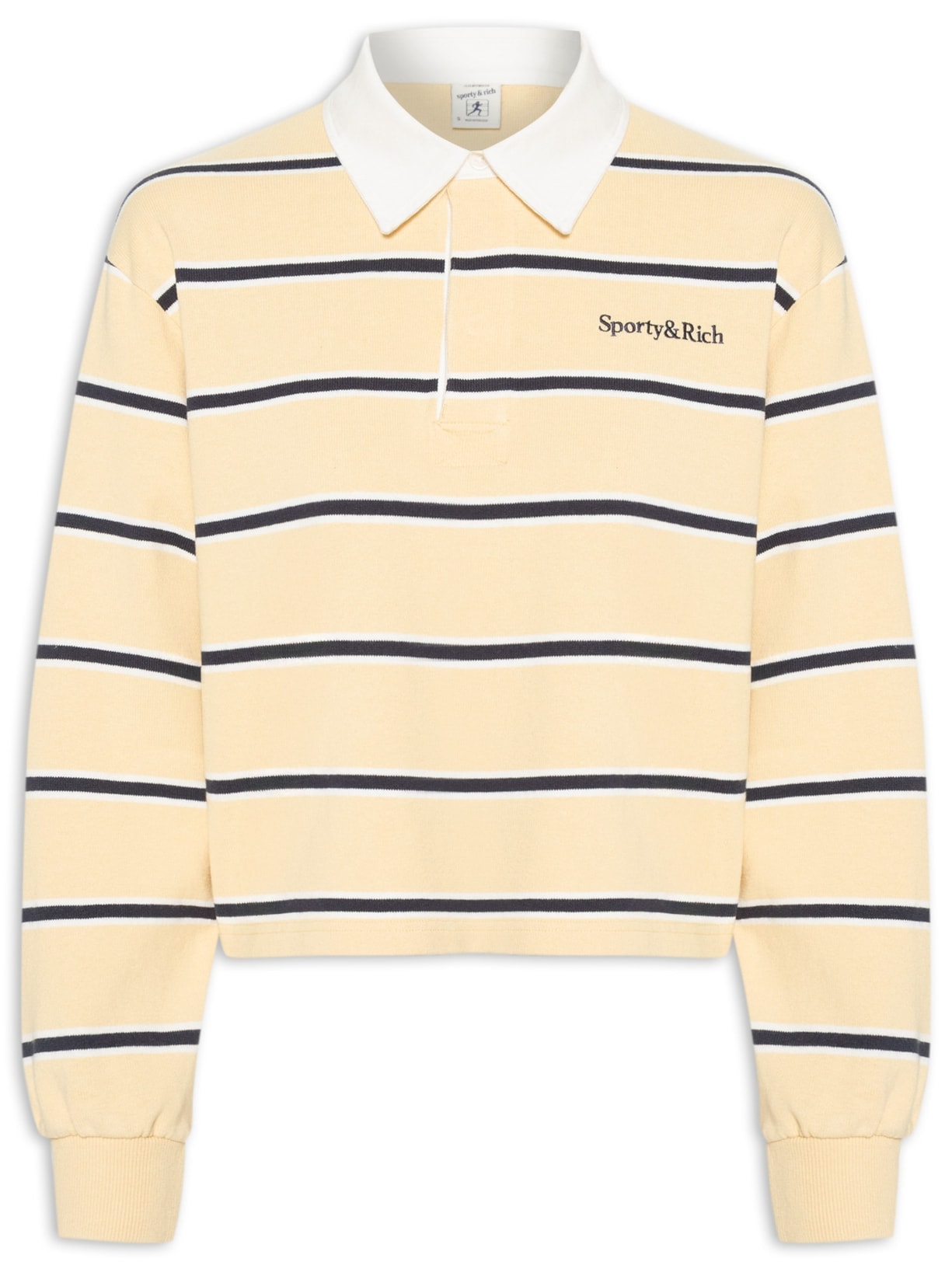 A polo amarela é confeccionada em malha de algodão com média elasticidade. A peça solta ao corpo possui gola esporte em sarja branca e com botões aplicados, mangas longas com ajuste nos punhos, ombros estendidos, padronagem listrada em cores contrastantes, nome da marca bordado na cor azul marinho na altura do busto e comprimento cropped*.