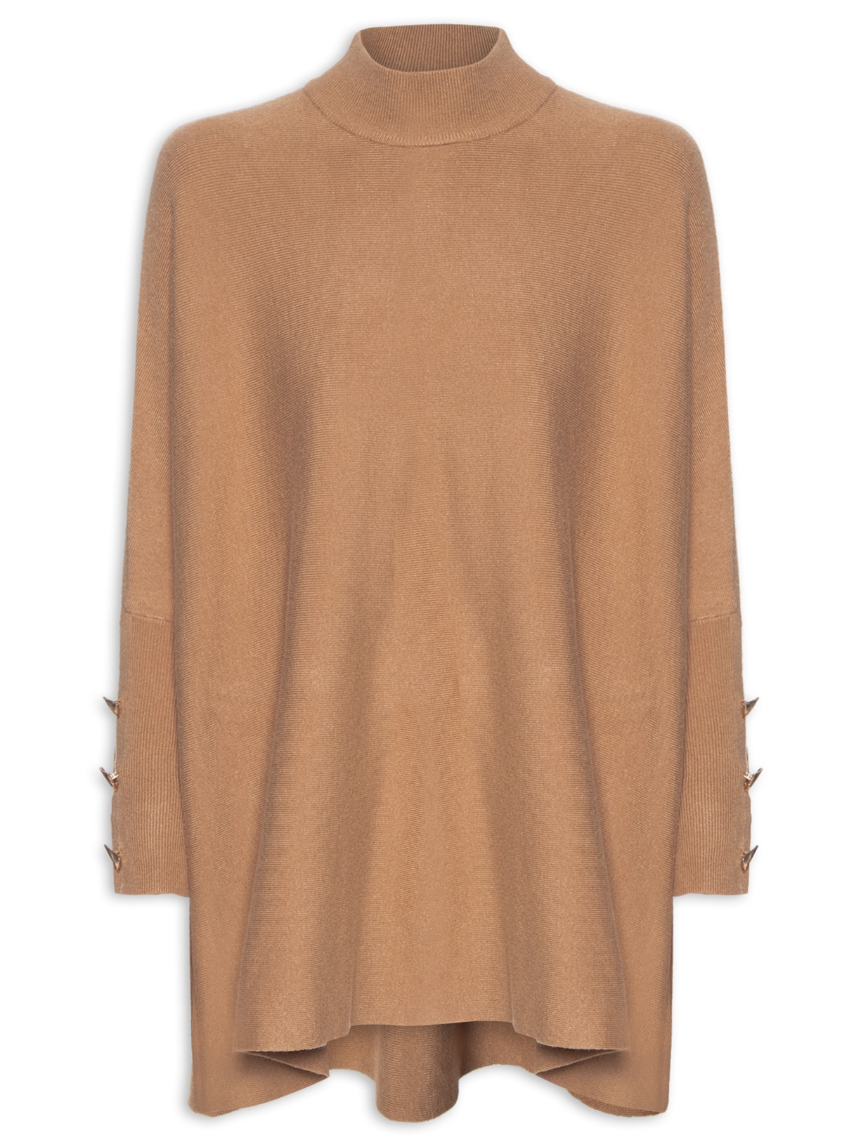 O poncho marrom é confeccionado em tricot com alta elasticidade. A peça solta ao corpo possui gola alta, mangas longas com ajuste e botões aplicados nos punhos, logo da marca aplicado em metal na parte posterior e comprimento alongado.