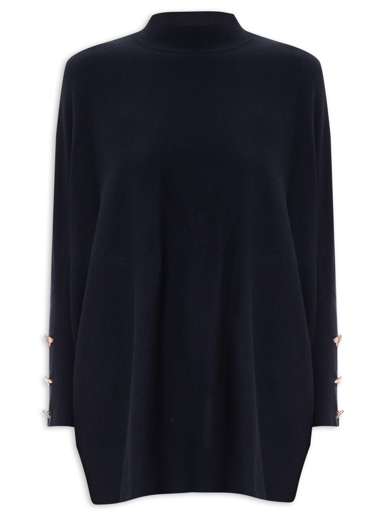 O poncho azul é confeccionado em tricot de alta elasticidade. A peça solta ao corpo possui gola alta, mangas longas de modelo morcego com botões decorativos e metalizados aplicados, tag metalizada da marca aplicada na parte posterior, acabamento canelado e comprimento alongado.