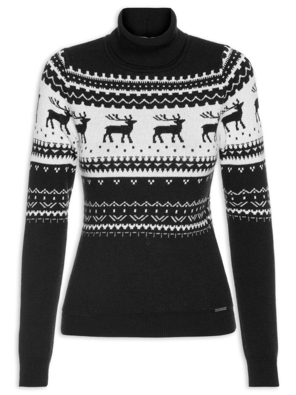 A pullover preta é confeccionada em tricot jacquard com elasticidade. A peça justa ao corpo possui gola alta, mangas longas, mix de padronagem na cor branca, estampa jacquard, tag metalizada da marca na lateral e acabamento canelado nos punhos e na barra.